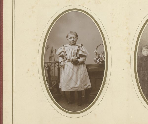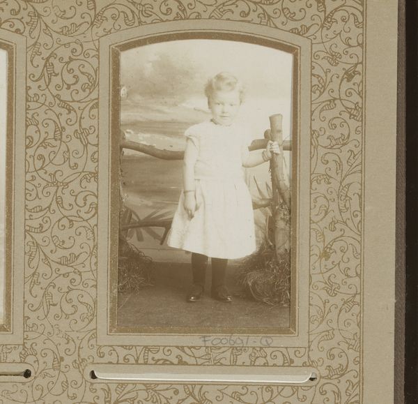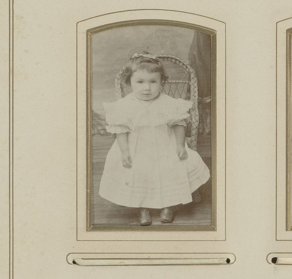Editor: Here we have Josephus Hendrikus Petrus Coppens' "Portret van een meisje, staand bij een stoel," a photograph, likely a print, created sometime between 1889 and 1925. It's such a formal portrait. What do you see in this piece, beyond the sweet depiction of a young girl? Curator: It’s more than just a quaint portrait. Think about the socio-political context. During this period, photography became increasingly accessible, but studio portraits still held significance, especially for those aspiring to a certain social status. The girl's ruffled dress and the carefully arranged setting point to that. Who had access to that formality, and who was excluded? Editor: So, the photograph signifies more than just memory; it's about class and maybe even aspirations? The staged quality feels intentional now. Curator: Precisely. Consider the gaze of the girl. Does she appear comfortable? Or is there a sense of unease, perhaps reflecting the expectations placed upon young women during this era? It makes me wonder what was expected of women, particularly those of a certain class, and how this photograph might reinforce or challenge those expectations. The slight awkwardness adds to it. Editor: I didn't consider her posture before. It isn't a relaxed pose at all. The chair seems like a prop almost, emphasizing the constructed nature of identity, especially for young girls. Curator: And isn't that the crux of it? We're looking at a performance, a constructed identity meant to convey respectability and belonging. Examining these images critically helps us unpack the subtle ways power and identity intersect. What was her lived reality compared to the image presented? Editor: I see it now! It's a representation loaded with social meaning. I appreciate how that reframes what might seem like just a simple portrait. Curator: Indeed, art like this urges us to consider deeper issues around gender, representation, and social power.