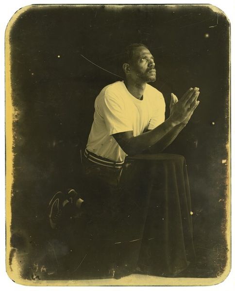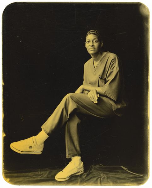 Editor: We're looking at "Pick," a photograph taken by Deborah Luster in November of 1999 at Angola, Louisiana. It depicts a man in work clothes, caught in a moment of contemplation. What do you see in this piece? Curator: This image resonates deeply with historical echoes and symbolic weight. Consider the man's pose, hand to chin – an archetypal symbol of thought, but placed against the reality of his attire, hinting at physical labor. Think about the weight carried within that image: who is he, what is he thinking? Editor: The location, Angola, also adds another layer, right? Isn't that a notorious prison? Curator: Precisely. The name itself conjures the history of slavery and exploitation. Luster isn't just showing us a portrait; she's presenting a complex symbol. The man, adorned with the trappings of labor, embodies generations marked by forced servitude, by inherited oppression. Do you see it in his gaze? Editor: I do. There's a resilience there, despite the weight you mentioned. But it also raises questions about representation – whose story are we really seeing? Curator: That's a critical point. Luster is prompting us to confront the complicated relationship between representation and reality. The man's individual story intertwines with the larger narrative of a place steeped in injustice. How do these histories exist within the picture plane and beyond it? Editor: It's much more than just a picture, then. It’s an icon, charged with historical memory and the ongoing struggle for dignity. Curator: Exactly! And that's the power of the image, isn't it? The compression of so much cultural weight into a single, arresting portrait.