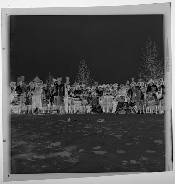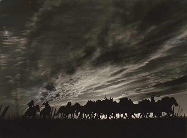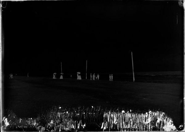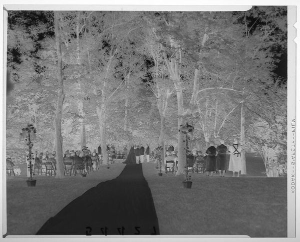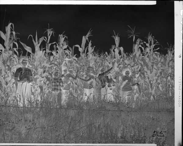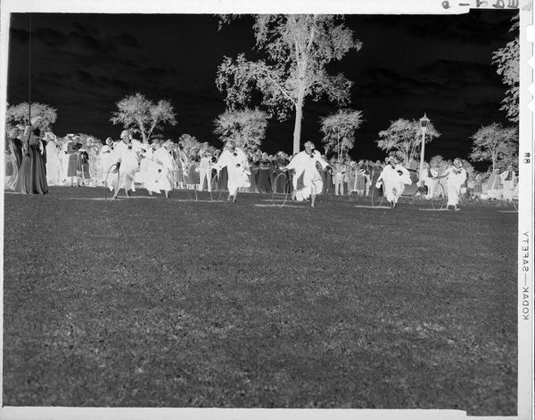 Editor: This is an untitled photograph by John Howell, showing men playing a game on a lawn. The inverted tones create a ghostly, dreamlike quality. What symbolic echoes do you find here? Curator: The inverted image immediately brings to mind the shadow self, that part of us that remains hidden. Group activities often symbolize social cohesion, but here, the figures, rendered in negative, appear disconnected. What cultural rituals or memories might this evoke? Editor: That's a striking observation, the idea of a shadow self within a social context. Perhaps the game itself is a metaphor for societal roles and expectations? Curator: Precisely. Consider how games, as formalized play, mirror larger social structures. Could this be a veiled critique of societal norms? What emotional responses does this spectral rendering elicit in you? Editor: It evokes a sense of unease, a feeling that something is not quite right beneath the surface of this seemingly ordinary scene. Curator: An unsettling revelation, indeed. The image prompts us to look beyond the familiar, to question the symbols that shape our understanding of community and identity.
