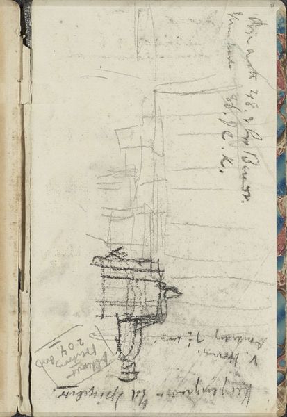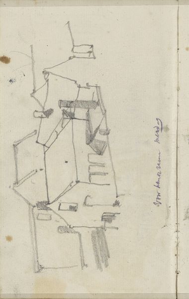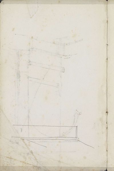 Editor: This is "Architectuurstudie," an architectural study by George Hendrik Breitner, created sometime between 1886 and 1898. It looks like watercolor on aged paper, currently held at the Rijksmuseum. It has such a fleeting, almost dreamlike quality. What elements of its composition strike you? Curator: The incomplete, sketchy lines are key to understanding its semiotic function. Breitner is not aiming for photorealism but rather an exploration of form. The watercolor bleed further contributes to this sense of impermanence. Editor: So you're saying the looseness is deliberate? It doesn't try to give a clear representation, more of a feeling. Curator: Precisely. Consider how the artist uses line weight and perspective. Observe the structural relationship among the basic geometric forms. Do you see any instances where a line is left open, or where one form bleeds into another? Editor: Yes, there are several lines which seem to stop midway, and the use of watercolor bleeds gives this unfinished quality to the structure's edges. This contributes to that sense of something not quite real. What does this say about the role of sketching? Curator: I believe he may have been more interested in capturing the essence of the architecture. The architectural sketches offer us insight into the process by which he distilled his observations into pure form. In essence, what Breitner has provided for us is the deconstruction of visual experience into a formal record of its most basic components. Editor: So, it's not just about what's depicted, but how it's depicted and what that process reveals about the artist's intention. Thanks! It makes me appreciate it a lot more. Curator: It reveals the essence and materiality, offering new formal perspectives.