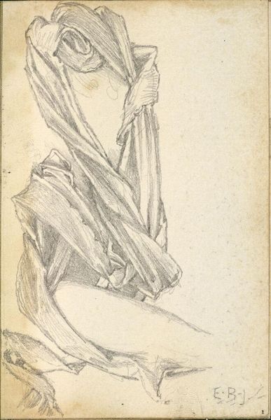 Editor: This is Edward Burne-Jones's "Drapery Study with Foot," a delicate pencil sketch. It feels quite academic, almost like a classical fragment. What do you see in this piece? Curator: Drapery, especially in the Pre-Raphaelite context, is rarely just fabric. Think of the emotional weight it carries: concealing, revealing, suggesting form, and implying movement. What stories might these folds be telling? Editor: You're right, I hadn't considered the narrative potential. It's like the drapery itself is a character. Curator: Precisely! Burne-Jones uses it to evoke a sense of timelessness and perhaps even repressed emotion, echoing classical ideals. Editor: I see it now! It really shifts my understanding. Thanks! Curator: Indeed, visual symbols carry legacies across art history.