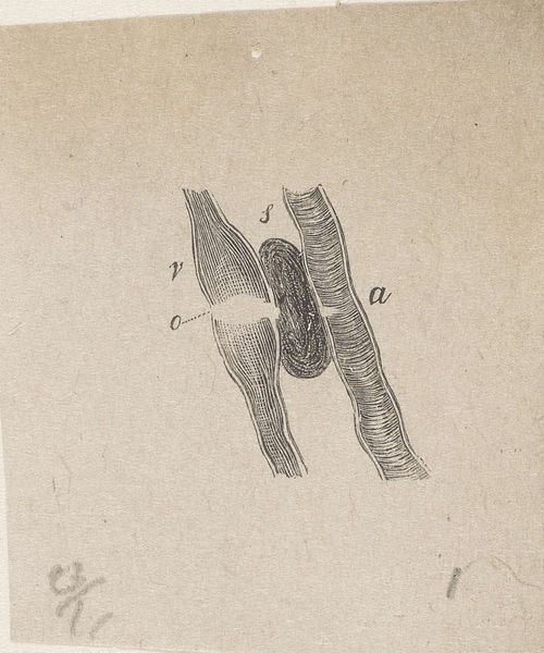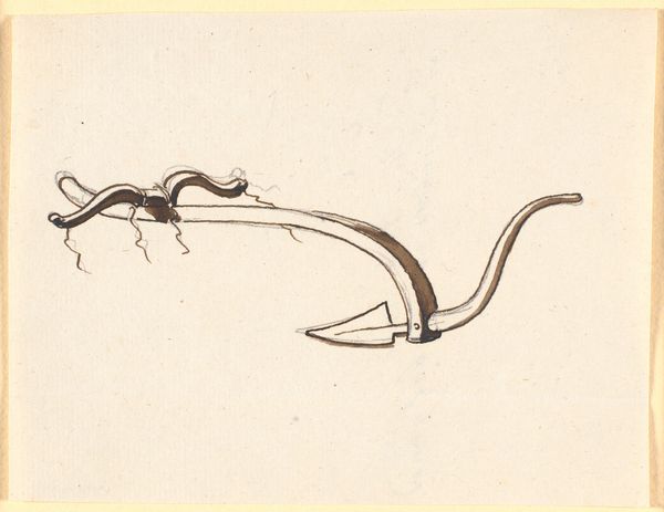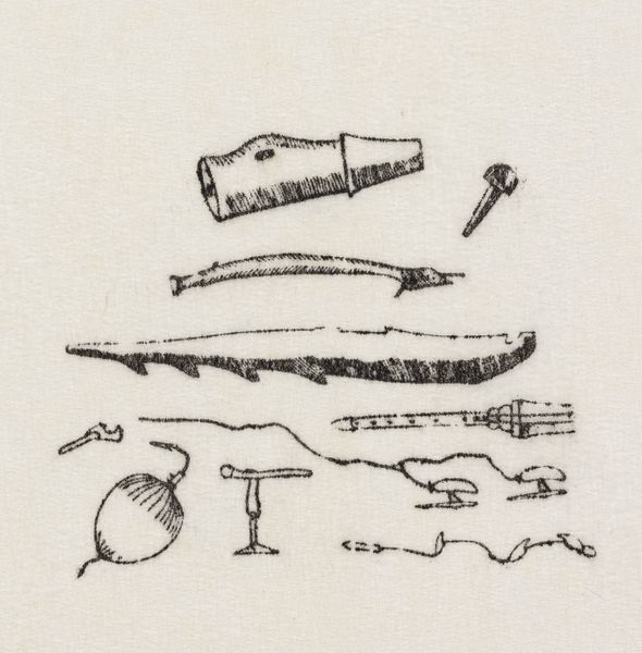 This is a drawing titled 'Værktøj', or 'Tools,' by Abraham, created around 1860. It's rendered with ink on paper. The artist has depicted a series of implements that appear to be made from organic materials, possibly bone, wood, or antler. Look closely and you’ll see the textures and forms of the materials are rendered in spare, but descriptive, lines. The drawing style feels almost like a technical illustration, emphasizing the functional design of each tool. We can consider how these tools were conceived, how they were designed for efficiency and purpose, and how their forms are directly related to their function. The tools point to a society deeply connected to the environment, where resources were skillfully harvested and transformed into essential objects. In our own time, we might overlook the artistry inherent in such functional items. But this drawing reminds us of the creativity embedded in everyday life, before the separation between art and utility became so pronounced.