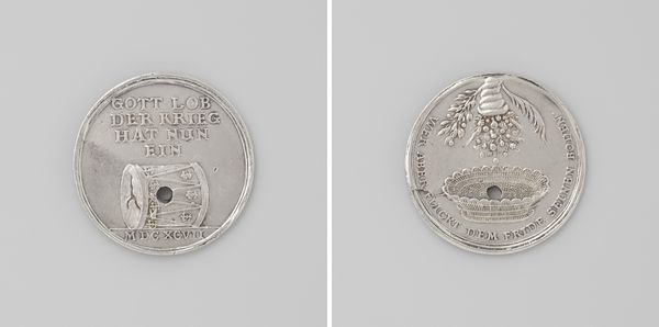 Curator: So, we're looking at a fascinating commemorative piece by Ronald van Tienhoven, entitled "Eerste slag: 400 jaar Nederland-Manhattan." It’s a work from 2009 that appears to be a print or relief on metal, taking the form of a coin or medallion. Thematically, it clearly references the history of Manhattan, in the context of the Dutch colonial history. Editor: Huh, it feels surprisingly...cold. Like a lost coin from some alternate reality where New Amsterdam never became New York. I like the clinical precision though. The lines are so sharp, like an architect’s fever dream etched in silver. Curator: Indeed, that visual coolness speaks volumes, especially given the complexities of colonial narratives. It invokes the act of memorializing a specific version of history, prompting us to reflect on the power dynamics embedded within that act. How do we interpret the inscription referencing the Half Moon sailing up the river? Who does that history center? Editor: I get a faint sense of vertigo looking at the two sides of the coin. One side's all hard-edged cityscape, while the other has this ghostly island silhouette… it’s like two different versions of the same story wrestling for dominance. And, dare I say it, maybe history IS just currency in a way, right? We keep trading versions, upping the value of some narratives while debasing others. Curator: I agree. Think about the composition, the cityscape occupying a privileged space while the Indigenous name 'Mannahatta' and a map representing the original topography becomes secondary, a recessive engraving on the verso of the coin. Van Tienhoven appears to be urging us to critically examine which stories are valued and whose perspectives are marginalized. Editor: It's kind of chilling when you see it like that! I'm thinking it really makes the work stronger in ways the artist might not have imagined at first. It’s like, is he commemorating the anniversary or critiquing it? Both maybe? That uncertainty makes the artwork richer, you know? Curator: Absolutely. It encapsulates the inherent ambiguity of historical representation and colonial legacies, urging a necessary reckoning with historical truth and reconciliation. It isn't just a memorial, it’s a conversation starter. Editor: So, next time you find spare change, check both sides of the story before spending it. Okay, maybe not… but seriously, great way to look at history!