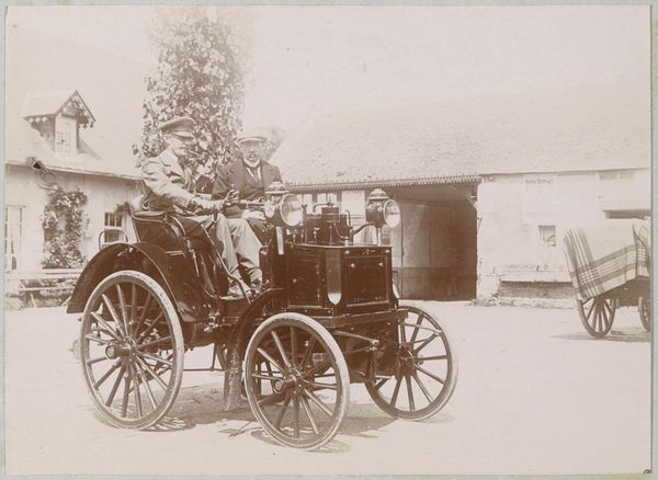 Editor: This photograph, "Deelnemers aan de race Parijs-Amsterdam in hun automobiel, vermoedelijk in de regio Nijmegen," taken in 1898, captures a rather monumental moment, I think, but it feels almost casual. The car is clearly the star, yet it's framed by everyday people. It gives the scene a lovely humanness. What draws your eye in this piece? Curator: Well, isn't it all about time travel, really? Staring at that photo, I find myself hurtling back to an era where the car wasn't just transport, but a symbol of almost defiant progress, an arrogant stride into the future. Notice the driver's attire - almost excessively formal. Is he embracing the gravity of the technological advancement, or is he completely unaware? Editor: Interesting, so you're picking up on this duality as well. The men seem quite serious, perhaps even a bit unsure. Curator: Exactly! Perhaps they sensed the machine's impending dominance? The casual onlookers only enhance that uncertainty. I’d say it's a photograph about our strange relationship with machines. Look closely at their faces; what stories do *you* imagine they hold? Editor: I imagine they are equal parts thrilled and terrified! And I hadn’t thought of it as time travel, but you’re right, seeing that early car feels both ancient and incredibly modern. Thanks, this has been a revealing peek into the past and future, simultaneously! Curator: My pleasure! I do think there's something wonderfully poetic about these glimpses into a world on the cusp of profound change. Every picture whispers a multitude.