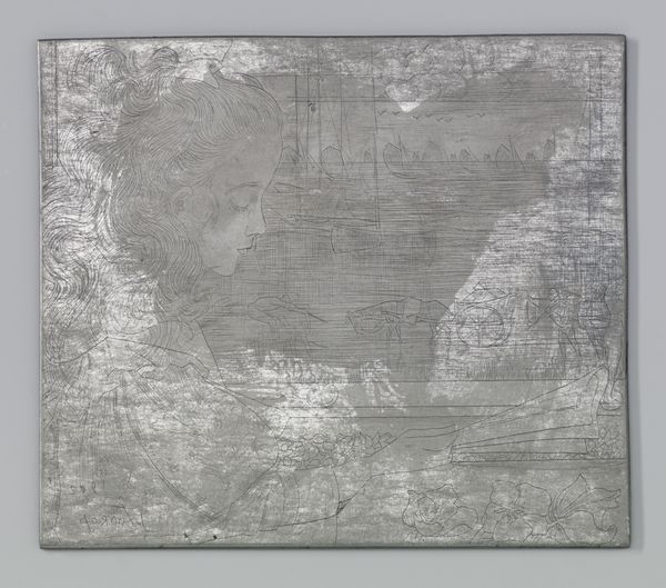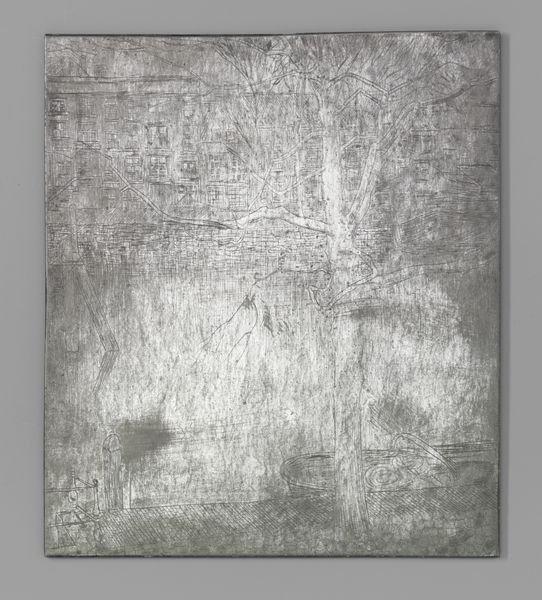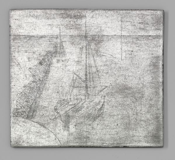 Curator: This etching, "Kanaal bij Katwijk aan Zee," was created by Jan Toorop around 1901. Look closely at the delicate lines achieved using a metal plate; it's now part of the Rijksmuseum's collection. Editor: The overall effect is overwhelmingly gray. There is something both industrial and natural about the stark, almost photographic feel that I can't put my finger on. What would you say? Curator: Interesting. I see, beyond a topographical depiction, something of an attempt to depict the transition of Dutch society and tradition; the etched metal acts as a signifier of these transitions. The waterways, an icon of commerce and passage for centuries in Holland, are rendered almost ghost-like, as if they are fading into industrial modernity. Editor: Fading... yes, the etching work, almost like hurried sketches, contribute to that ephemeral quality. But do these impressionistic renderings indicate Toorop sought merely to depict the industrialization? What if, say, it was purely an investigation of texture, of light playing on water and the sky reflecting on metallic surfaces? It feels fundamentally aesthetic, driven by sensation over symbolism. Curator: That’s valid; however, you cannot dismiss Katwijk’s historical role as both a fishing village and a crucial point for naval activity; such spaces carried the hopes and anxieties of Dutch maritime culture. By reducing this bustling activity into subtle grey textures, the work almost feels melancholic, laden with a sense of historical awareness. I would propose the light isn't arbitrary but represents a vanishing cultural history. Editor: Hmm... but even if the subject holds that symbolic weight, the style suggests an emphasis on immediate sensory perception over long-held cultural memories. It doesn’t demand you reflect. Curator: Fair, but the symbolic can emerge precisely *through* the sensory. What's rendered and, perhaps even more crucially, *how* it's rendered communicates volumes, beyond simply capturing what is visible. The impressionistic style itself speaks to that break. Editor: An interesting angle. Considering the weight we have placed on form versus symbol, there’s clearly much to unpack regarding its depiction and its legacy.