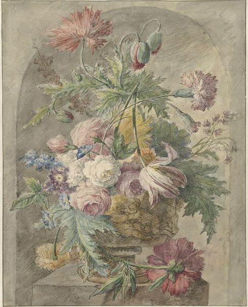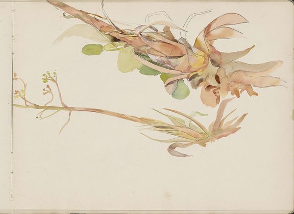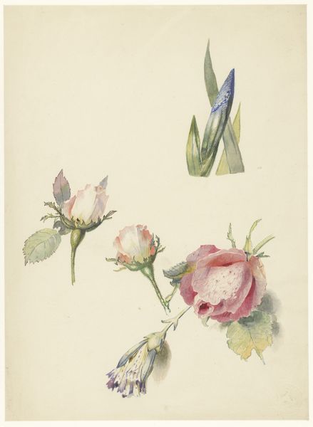 Editor: Here we have Dankvart Dreyer’s "Studier af forskellige blomster, bl.a. valmuer," Studies of different flowers, including poppies, from the 1840s, created using watercolor and drawing. It’s a lovely composition of different blooms, rendered with such delicate brushstrokes. What do you see in this piece? Curator: What immediately strikes me is the structural use of space and the careful consideration of line versus wash. Note how the artist has delineated the poppy seed pod with crisp, unwavering lines, contrasting sharply with the blurred edges and diluted pigments used to portray the blooming poppy. It exemplifies a Romantic era concern with both observation and emotion. Editor: Yes, the contrast between the distinct lines of the pod and the softness of the poppy is interesting. Can you elaborate on that tension? Curator: Observe how the limited palette and soft gradations create a sense of atmospheric perspective, flattening the picture plane. The almost unfinished quality pushes us to consider what's really essential to representing the idea of 'flower'. Is it pure representation or evocation? Editor: That's a really interesting way of putting it. Focusing on those intrinsic artistic qualities definitely reframes the piece for me. Curator: Precisely. We move past the representational subject matter and dive into the poetics of form itself, a game of what the flower is to the eye versus the impression the flower leaves behind. Editor: I agree. Focusing on how Dreyer uses line and wash, as well as the color, really opens up new ways of appreciating his work. Curator: Indeed. The material quality of the painting guides our understanding and reception.