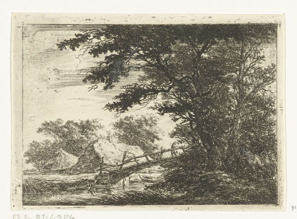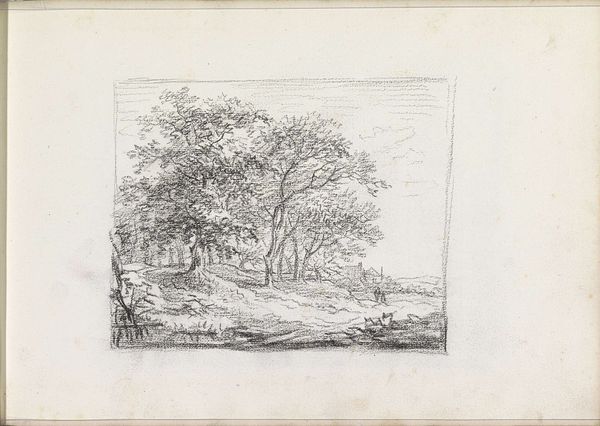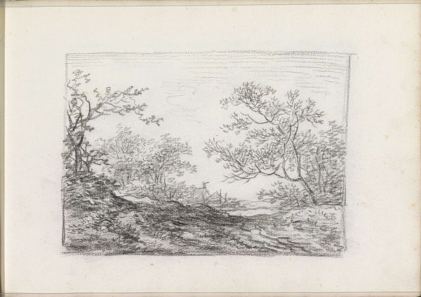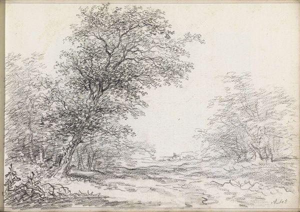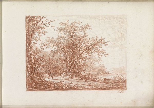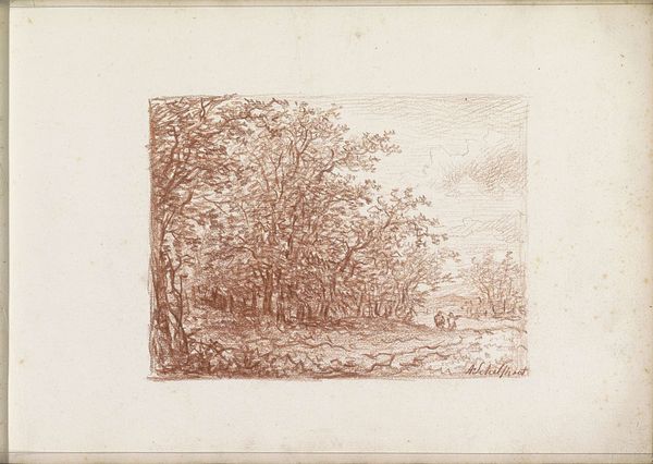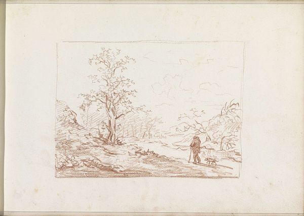 Curator: Andreas Schelfhout created this drawing, titled *Landscape with a Man and Boy on a Path*, around 1811. It’s rendered in pencil on paper and held at the Rijksmuseum. Editor: The sepia tones and delicate rendering give it a remarkably calm feeling, like a memory fading at the edges. Curator: The artist’s strategic use of line weight really does direct the eye. Notice how the foreground is rendered with heavier, more defined strokes, which then softens and almost disappears in the distance. Editor: And look at the implied narrative, the intergenerational journey perhaps? Considering the context of the Napoleonic era, one has to ask about the implications of generational inheritance during social upheaval, especially for Dutch citizens? Curator: Fascinating interpretation! Looking solely at the formal composition, the receding road functions as a vanishing point, anchoring the entire composition to a perspectival structure reminiscent of 17th-century Dutch landscapes. Editor: Sure, but this wasn’t simply about adherence to the Golden Age tradition, but a reimagining in a time when the Dutch Republic was no more. Could this simple scene symbolize anxieties around masculinity and homeland in the face of occupation? Curator: It is easy to appreciate the delicate execution of details using only the pencil; particularly the branches silhouetted against the sky, which evoke a sense of atmosphere despite the absence of color. Editor: The landscape feels simultaneously familiar and distant. This rendering presents the figures of the man and boy as dwarfed by their setting. They represent perhaps the everyday experience of navigating landscape changed forever by political will. Curator: It's a masterful handling of light and shade. Schelfhout emphasizes the contrast between the dark woods in the foreground, subtly offset by a diffuse glow. The work, undoubtedly, offers a rigorous aesthetic encounter. Editor: A perspective indeed enriched by its engagement with historical forces! It pushes us to question whose stories are rendered and, more importantly, who remains un-depicted in Schelfhout's idyllic scenery.