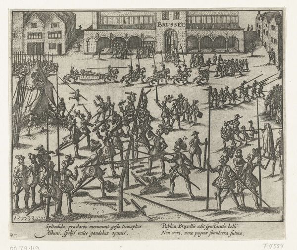 Curator: Looking at this detailed engraving by Frans Hogenberg titled "Hendrik IV goes to church in Saint-Denis, 1593," dating from 1593 to 1595, I'm struck by how carefully constructed the narrative is within the print's confines. Editor: It feels like two scenes stitched together. A stately, ceremonial entrance on the left contrasts with a public display of horsemanship, almost chaotic in energy, to the right. Curator: Exactly! Hogenberg masterfully captures Henry IV's conversion to Catholicism in 1593. This strategic political maneuver allowed him to be crowned King of France and pacify the country after years of religious war. Notice how the interior scene is all solemnity and controlled lines. Editor: The columns form almost a cage, and the crowd watching him seems like a separate world. Yet Henry moving into that space signals a symbolic shift, embracing not only a new religion but the power dynamics of France itself. I see symbols of cleansing, absolution... the somber hues reinforcing it. Curator: Precisely. Saint-Denis was, and is, an incredibly powerful symbol. It held significant royal weight as it served as the burial place of French monarchs. By converting and going to church there, Henry made a calculated visual statement. It’s interesting that Hogenberg depicts what might have taken place outside simultaneously with the procession. Editor: I find the outdoor equestrian display fascinating. It could speak to the public celebration of Henry’s conversion and kingship, while at the same time suggesting the continued military aspects needed to retain order and peace. The horses, often stand-ins for nobility and power, racing freely. It evokes a show of strength after a long and difficult conflict. Curator: And let’s not forget the group gathered in the grandstand, also celebrating Henry’s coronation. I wonder about the commissioning and reception of this print, destined, in all probability, for distribution and propaganda to consolidate support. It had the function of solidifying Henry’s newly legitimized place in power. Editor: It's impressive how Hogenberg blends ceremony and political strategy into a single image, using potent iconography and visual language to sway public opinion, and visually codify Henry's conversion. Curator: It really drives home the immense social and political stakes inherent in Henry's choice and actions during that tumultuous period in French history. Editor: A true masterclass in visual persuasion, reflecting how personal faith intersects with immense political force, influencing history through symbolic representation.