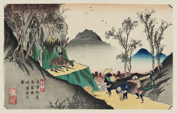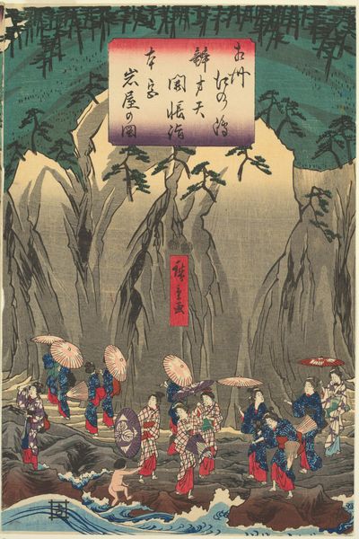 Editor: This striking triptych, "Pilgrimage to the Unveiling of Benzaiten at Enoshima in Sagami: Caves at the Main Shrine" by Utagawa Hiroshige, shows crowds heading toward caves. The scale feels epic, yet intimate. What can you tell me about the cultural context of this pilgrimage? Curator: Hiroshige masterfully captures the popularization of religious tourism in 19th-century Japan. Enoshima, dedicated to Benzaiten, a syncretic goddess of wealth and music, became a major pilgrimage site. Notice how the print subtly promotes this site. Editor: So, it's both art and advertisement? Curator: Precisely. The image invites viewers to participate in this cultural phenomenon, reinforcing Enoshima's significance. Consider how the print itself would have been circulated, further shaping perceptions of this sacred space. Editor: I see. The print serves a social function. Thanks! Curator: Indeed! It highlights the fascinating intersection of religion, tourism, and the burgeoning print culture of the time.