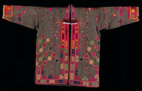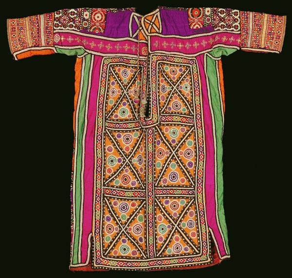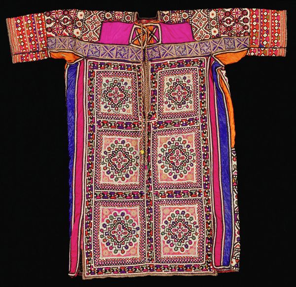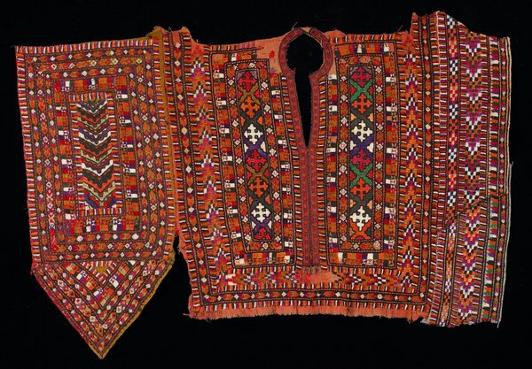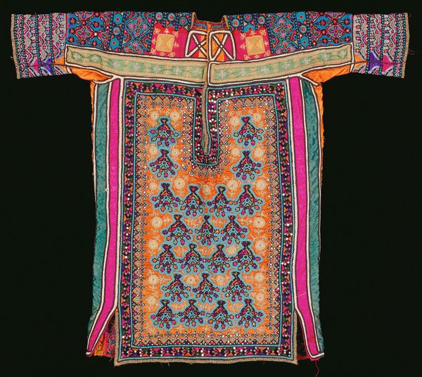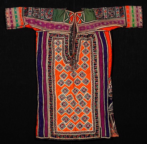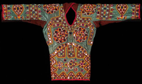 Curator: Look at this magnificent “Blouse” by the Dhebaria Rabari subgroup, crafted sometime in the mid-20th century. Its intricate mixed-media construction incorporates diverse fibre-art techniques. Editor: Whoa! It looks like a kaleidoscope threw up on a blouse—but in the best possible way. So much color and teeny tiny detail. Like a wearable hug of joyful chaos! Curator: Exactly. Consider the social and economic context—the blouse isn't just clothing, but a testament to the maker's skill and status within their community. Note how the textiles and patterns also indicate cultural identity and affiliation, functioning as a vital component of nonverbal communication within and beyond the Rabari subgroup. Editor: You can almost feel the patience and love stitched into it, can't you? And all those repetitive geometric motifs, like prayers whispered into fabric… reminds me of the comfort in ritual. It is fashion and textile design, combined. Curator: Let's not overlook the sheer labor involved. From sourcing materials to the meticulous hand-embroidered details. The mirrored accents, strategically placed to catch the light, add a dimension of material value as well as, quite literally, reflect back the world and community. Editor: Those mirrored accents! That's what got me. Each tiny piece reflecting back fragmented versions of whoever is wearing it—so you literally carry your world with you. I can see how this Blouse is way more than just pretty, it's carrying its context around on it! Curator: Indeed. We must consider its potential circulation. Its functionality, yes, but also its journey—possibly for trade, use at specific life events. These aren't inert design elements; they’re coded markers with significant use value. Editor: You’ve given me such a fuller picture. Looking at it now I feel more sensitive to its story. Thanks for letting me play art detective with you. Curator: The pleasure was all mine. It’s always insightful to witness how personal experience intersects with social history in shaping meaning and valuation.