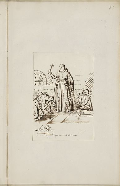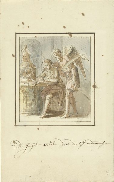 Curator: This intriguing drawing, made by Teodoro Matteini in 1808, is titled "Napoleon Thinking on a Chair While Fame Shows Him Pluto and the Damned." It presents a fascinating, albeit perhaps unflattering, allegorical view of Napoleon. What’s your first take? Editor: Immediately, the draftsmanship grabs me. Look at that fine line work, the crisp delineation creating this whole scene with such delicate precision! And the stark contrast between the celestial figure and the underworld scene creates a compelling duality. Curator: Yes, Matteini's piece certainly offers a symbolic commentary on power and legacy during Napoleon's era. Consider the political implications of depicting Napoleon facing his potential damnation even at the height of his power. It hints at anxieties surrounding his ambition and the human cost of his conquests. Editor: I'm more drawn to how Matteini orchestrates our visual reading of the piece. The floating figure of Fame, juxtaposed against that solid, almost oppressive, neoclassical column... the movement versus stability. Plus, the perspective cleverly pulls us from Napoleon's pensive posture toward the chaotic realm of Pluto. Curator: That realm representing damnation is a visual strategy linking Napoleon’s ambition directly to its potential consequences. Artists during this time were deeply engaged in the conversation of Napoleon’s role within Europe’s historical narrative and often leveraged classical allegories. Editor: I see it, and yet… beyond the iconography, there’s a formal elegance I can’t ignore. The composition itself, even with that subject matter, is so classically balanced. Notice how the column anchors the chaotic energy on the right? And consider the artist's masterful use of line to sculpt form and define space. Curator: Agreed. Though ultimately, I believe, Matteini is positioning this work within a broader critique. What is remembered, how one will be remembered, are core issues driving the imagery during a period of seismic historical events. The art acts almost like a public service announcement. Editor: A visual warning, perhaps, encoded in an aesthetic so refined, it's easy to miss the severity of its statement! Ultimately, Matteini's visual vocabulary—the lines, forms, and contrasts—powerfully amplifies his historical narrative. Curator: It shows that art isn’t divorced from society but deeply rooted in its questions, fears, and hopes. Editor: Indeed. The drawing, in its composition and themes, reflects Napoleon's era while also critiquing it.