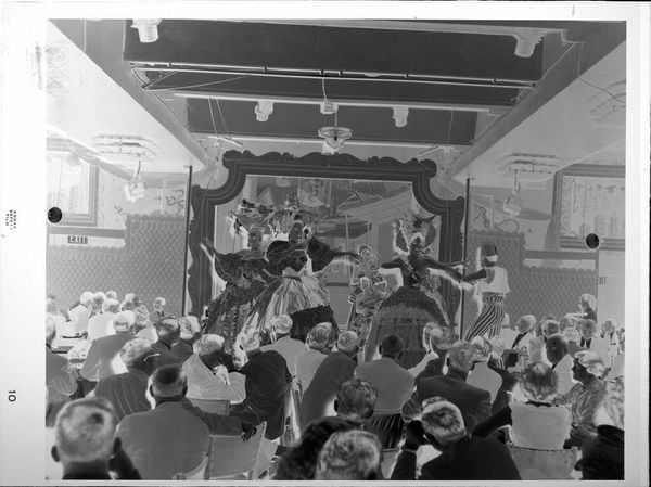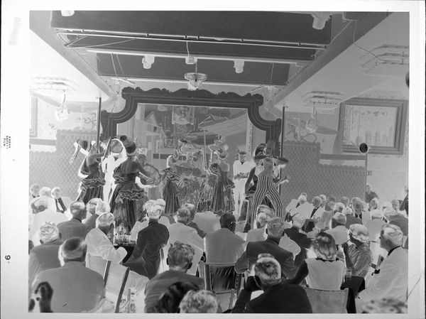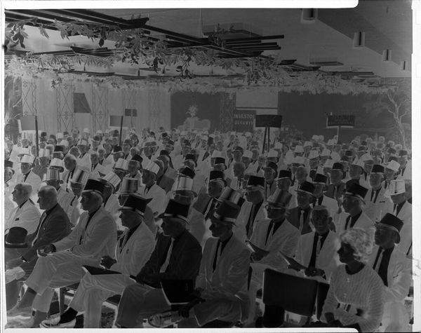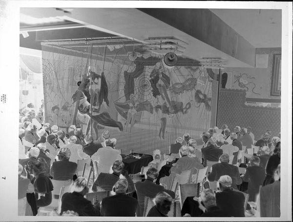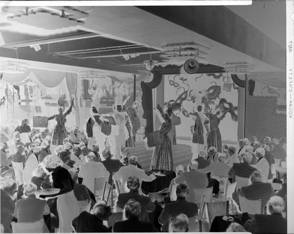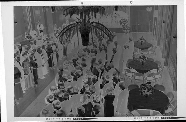 Editor: This gelatin silver print by Peter James Studio depicts performers on stage. The negative image gives it a strange, ethereal quality. What can you tell me about the production of this image? Curator: The negative printing process itself is part of the story. Consider the labor involved in staging the performance, and the photographer's role. How might these social contexts influence our understanding? Editor: That's interesting; I hadn't thought about it that way. Curator: The materials—the gelatin, silver, the camera itself—are all products of specific industries and economies. These aren't neutral choices. Editor: So, the act of making the photograph is as important as what it depicts? Curator: Precisely! The materiality and production of this object opens a whole new way of analysis. Editor: That makes me see the image in a new light. Thanks!