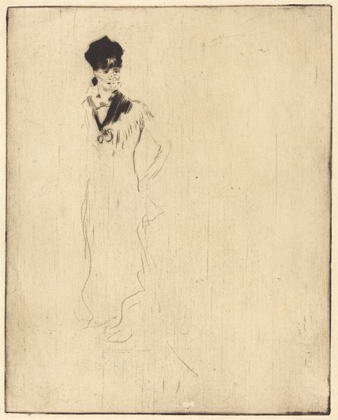Curator: This drawing is titled "Fashionable Young Woman Stepping Forward," and it's dated around the 1890s. It appears to be rendered in pencil. Editor: There’s a lightness to it, a sense of immediacy. The way the pencil is applied, especially in the dress, it almost floats off the page. You can feel the hand of the artist. Curator: Absolutely. During this period, you see the rise of mass-produced fashion and the evolving role of women in society reflected in these kinds of images, especially regarding societal representation. The figure becomes more present in the public imagination. Editor: And her dress! I imagine the process of constructing that dress. The labour involved in selecting the textiles, the cutting, sewing, all those layers and ruffles. It’s almost like a material biography embedded within the drawing. Curator: Precisely! It speaks volumes about the social hierarchy of the time and who had the resources for such elaborate clothing. Her presentation broadcasts her class and aspirations. How her representation impacts broader socio-political status of that time, it's all there! Editor: Do you think this could have been a preliminary study for a larger piece? The swift, almost frantic quality, leads me to wonder about the working process. I'm curious about the artist’s other projects and use of raw materials! Curator: It very well could be. Or it might have been for fashion illustration. Those drawings served the crucial role of conveying emerging styles and reinforcing ideas about fashionable identity. Editor: Either way, you feel that tension in the movement she takes; that very active "step forward," she seems a figure full of anticipation. And again, it goes back to process and intention. How was this constructed to become such a powerful, yet fleeting impression. Curator: And, as a study in gesture, this drawing captures an era’s ideals of feminine grace while reflecting shifts in representation within art and broader society. The study itself provides insight. Editor: It brings attention to the sheer materiality involved in these "impressions." These garments are made and worn by laborers for display as leisure, which I feel adds complexity. Curator: Indeed. Thank you for reminding us that every stroke is tied to so many social and material threads.