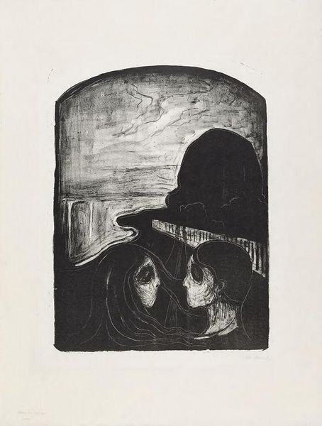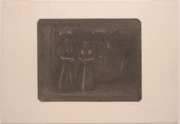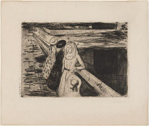 Editor: Munch’s "Kristiania Bohemians II," an undated etching, gives off such an unsettling vibe. It’s like peering into a shadowy, exclusive club. What symbols jump out at you? Curator: The masks immediately speak of hidden identities and societal roles, don't they? These figures, seemingly detached, represent a challenge to conventional norms. The central figure, imposing, might symbolize established power, disrupted by the chaotic energy of the Bohemians. What emotional responses do these symbols evoke? Editor: I feel a sense of alienation, like the figures are performing a role rather than being themselves. The wine bottle seems almost like a shared secret. Curator: Exactly. Shared rituals, but also potential corruption. Munch uses these symbols to explore the psychological and social anxieties of his time. It reminds us that beneath the surface, there’s often a darker truth. Editor: It's fascinating how much meaning can be packed into such seemingly simple images. Curator: Indeed, the power of art lies in its ability to reflect and challenge our perceptions of the world.
