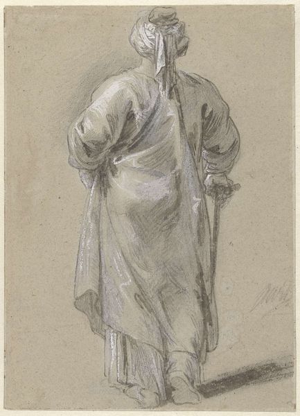 Curator: This is an intriguing, almost ghostly sketch titled "Kneeling Figure of a Nun," created by an anonymous artist sometime between 1600 and 1700. The piece currently resides at the Metropolitan Museum of Art. Editor: Immediately striking is its raw vulnerability. The ephemeral lines capture a stark devotion. It almost feels incomplete, as though caught mid-process of materialization. Curator: Precisely. The formal construction relies heavily on the contrast between the precise linework defining her features, and the broader, less definite rendering of her habit. There's a palpable tension. Editor: And look at the textures suggested within these lines. You can sense the roughness of the paper fighting the flow of ink and pencil—or is it charcoal? The visible struggle adds so much weight to her pious gesture. How would an artist choose these base materials to augment her moment? Curator: The semiotic weight is compelling. Consider the upward gaze – a classical gesture of supplication and its impact on the viewer’s emotional engagement. The open hands offer themselves into prayer. Editor: I agree about the gaze—it lifts our own. Though I keep returning to the labor embedded within this sketch itself, its materiality and function. How the artist carefully modulated each stroke for this image is evidence of process as devotional action. Curator: Undoubtedly. What are we to conclude then? This work encourages interpretation as an exploration of religious devotion and artistic process—it serves as evidence. Editor: It reveals how basic materials such as ink or pencil interact with an individual seeking solace. We should see them as inextricably bound together through labor and materials in the image.