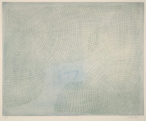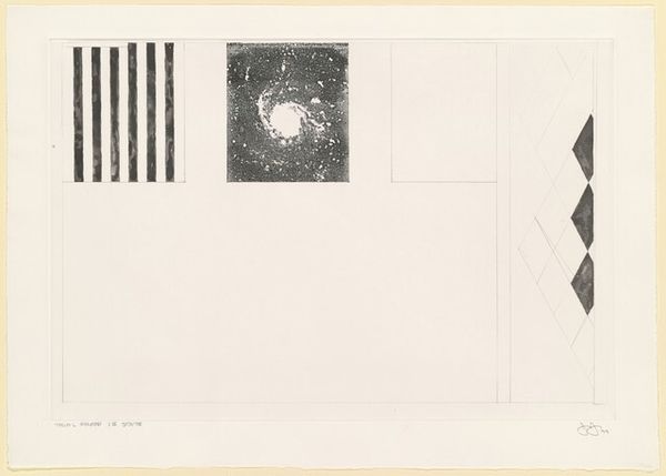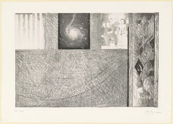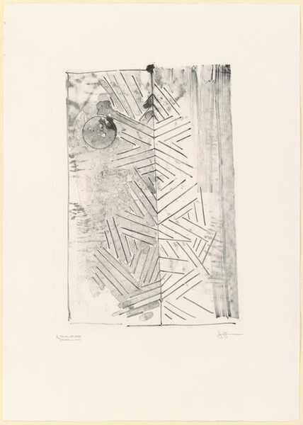 Curator: Jasper Johns' "Casts and Hatching," a mixed media monoprint and collage from 1976, splits the canvas in two distinct worlds. Editor: It's making me feel a little claustrophobic, actually. All those repetitive strokes... Curator: Ah, you're sensing the visual rhythm, a core element for understanding the language within this visual exploration. See how the textures, from the hazy, ghost-like cast impressions to the densely packed hatching lines, are layered? Johns challenges our perceptions of representation. Editor: It's less a picture, and more about...the act of picturing. Does that make sense? He is laying bare the bones of seeing. I think that’s why I find it interesting – the piece invites introspection. Curator: Precisely! It's Johns turning the mirror back on the viewer. Notice the use of gray graphite; It’s understated and encourages meticulous study. The contrasts force one to confront the ambiguity of form itself, inviting consideration on process. Editor: Almost like an academic exercise! Where’s the heart? Is it even about feeling at all? I want to connect. I look, and then, I question, question, question. All these layered, interwoven perspectives—aren't those supposed to guide our view? Curator: The heart may be concealed within Johns’ exploration of systems, rather than overt sentiment. However, I see emotionality and human fallibility etched onto the texture itself. Perhaps this methodical execution of “Casts and Hatching” reflects the tension in how we create meaning. Editor: I suppose it reflects Johns' commitment to a rigorous aesthetic program and, with further engagement, becomes quietly rewarding. Curator: So, as a kind of epilogue to this journey in grayscale and hatching lines, do you feel transformed by the dialogue we shared on this complex composition? Editor: Definitely a transformative viewing experience, even if I'm still feeling a touch anxious. The work makes you look at the mundane in a fresh light, like sifting through visual data. Curator: In this piece we see Johns as not just an artist, but also a philosopher meditating on our interaction with, and interpretation of the art and our world.
