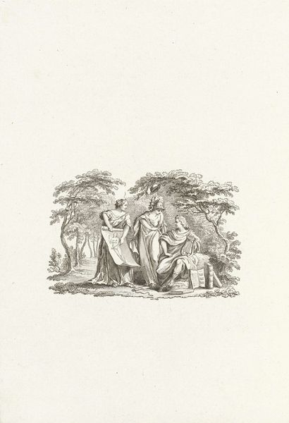 Gaspard Duchange created this print, Melpomene, Erato en Polyhymnia, in the 17th or 18th century. The composition is dominated by three female figures arranged in a landscape. Let’s consider the formal elements at play. The use of line, particularly in the drapery and foliage, creates a sense of movement and dynamism. The contrast between light and shadow, achieved through varied hatching and cross-hatching, models the figures and imbues the scene with depth and volume. The figures are placed as to create a scene of learned leisure. The engraving participates in a broader cultural discourse. The Muses, as symbols of artistic inspiration, serve to elevate the arts. Duchange uses classical motifs to legitimize and ennoble artistic practice. This print reflects the cultural values of its time, where classical ideals were used to frame contemporary artistic and intellectual endeavors. Note how the formal structure of Duchange’s engraving—the interplay of light, line, and classical motifs—not only constructs a visual experience but also engages with enduring questions about art, knowledge, and culture.