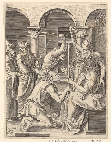 Curator: Here we have Cornelis Bloemaert’s “Saint Paul Preaching in Athens,” an engraving dating back to 1679. Editor: It’s visually striking. The composition has a dynamism; you can sense the fervor in Saint Paul's posture. But there's also a clear stratification of figures – some listening intently, others dismissive. Curator: Precisely! The artist masterfully employs line and shading to create depth and volume. Observe how Bloemaert's line work contributes to the image’s overall Baroque sensibility, heightening the drama. Note the classical architectural backdrop that gives it scale. Editor: True, the backdrop alludes to its specific historical context, that crucial moment in the New Testament when Paul directly confronted Athenian paganism. The stratification echoes societal tensions. Bloemaert visualizes those power dynamics effectively, with some visibly sneering while others show sincere engagement. Curator: Bloemaert presents the scene with such intentional symmetry, though. The positioning and grouping are hardly accidental, contributing significantly to the piece's balanced structure. It suggests a very conscious effort to arrange each figure. Editor: Arranging as a conscious rhetorical strategy. In doing so, the work encourages the viewer to ask: what does it mean to listen? Who gets heard, and who is disregarded or silenced? We might ask ourselves those questions, as an allegory to the art world, even today. Curator: A potent question, yes, though my analysis finds most resonance in the composition as its strongest argument, how this particular structure creates meaning beyond its subject matter. Editor: Yes, certainly a masterclass in its handling of technique and composition, but understanding what exactly that technique is deployed *for* leads us to think about cultural encounters, differing belief systems, and their lasting impact in our present times. Curator: Indeed. An important piece for anyone interested in engraving. Editor: Yes, certainly still potent for critical cultural insights centuries later.
