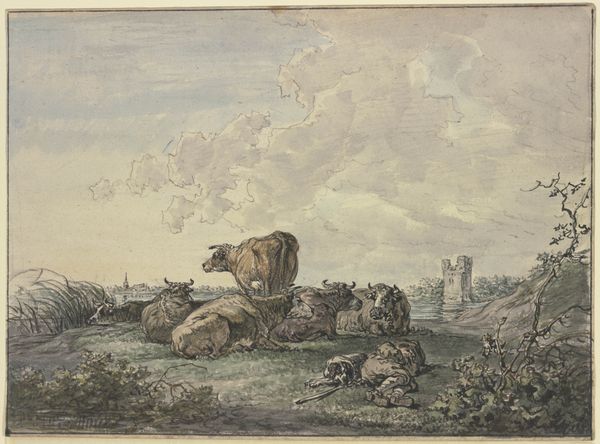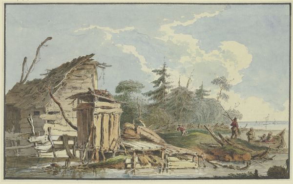 Curator: This is Jacob van Strij’s "Riverbank with windmill", housed here at the Städel Museum. It’s rendered with ink, chalk, and watercolor on paper, reflecting a moment of daily life in a Dutch landscape. Editor: It evokes such a stark, almost desolate feeling. The muted colors and spindly, bare trees create a wintery atmosphere. Despite the figures present, there's a sense of loneliness about the scene. Curator: Interesting. Considering the time, it probably demonstrates the close relationship that people maintained with their immediate environments; think about reliance on watermills for grinding grains. And of course the importance of waterways for transport of material goods, demonstrated here with people seemingly crossing to or from the city. Editor: That's true. The windmill itself looms large, a clear symbol of industry and sustenance. But consider the human figures. One strains pulling the cart, the figures in the boat labor at the oars, their work perhaps amplified by their diminutive forms—do they feel insignificant under its shadow, overshadowed by the machine and nature's indifference? Curator: We know van Strij worked outside—en plein air— and one thing that immediately stands out is his confident mark-making with a variety of materials. See how he's built up tones, created texture, almost scumbled the ink to give form and volume to that stand of trees, contrasting against more spare underpainting across the water? He clearly values the application process. Editor: Yes, and his specific choices lend themselves to symbolic interpretation. The water, for example, the very lifeblood of their commerce, becomes almost menacing here; and perhaps the people pulling their cart will fail in their journey. Those bare trees and muted earth tones might signal not just the season, but a kind of societal barrenness or hardship. Or, perhaps it evokes acceptance of an unchanging landscape and environment as well. Curator: Right. Van Strij used everyday, local scenes to demonstrate societal changes and to record how ordinary people survived at a moment when machine began replacing manual means. He probably ground his own chalk! That direct relationship with raw material underscores an emerging culture. Editor: Precisely. So the images offer far more than just pastoral charm or winter melancholy. Curator: Thank you. By delving into its production, materials, and figures, we understand this piece documents people living on the edge, facing an impending social transition. Editor: Agreed. By looking at his art more closely, one appreciates how symbolic imagery and attention to material converge to tell nuanced stories about nature and our complicated place in its order.