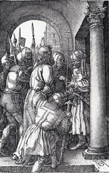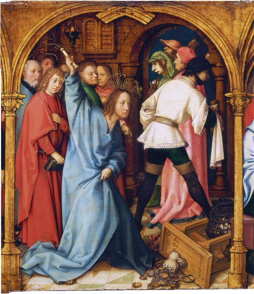 Curator: Hans Holbein the Elder painted this piece, Ecce Homo, around 1501. It now resides at the Städel Museum. Editor: It’s an unsettling piece. The muted colors and somewhat awkward figures give it a primitive yet powerful feeling. The scene pulsates with contained violence. Curator: I agree, there's a raw quality to it. The composition, while crowded, is structured by strong diagonals. Look at the stark contrast between the pale, almost sickly, flesh of Christ and the vibrant costumes surrounding him. It guides the eye. Editor: Absolutely. The clothing itself is laden with symbolism. Consider the grotesque, exaggerated hats. They are almost caricatures, embodying cruelty and perhaps societal corruption, acting as visual signifiers of injustice. Curator: Observe also the surface. The tangible presence of the brushstrokes brings the texture forward, creating an almost tactile reality of the event. See how the crown of thorns pierces his flesh, punctuated with those bright red spots? Editor: That crown is key. It's both a symbol of Christ's suffering and, paradoxically, of his royalty. Think about the cultural weight of that image through the ages – its repeated use to evoke empathy, guilt, and ultimately, faith. Curator: And consider the geometric patterning of the tiled floor; its intricate order is set in stark contrast with the disorder and injustice playing out on top of it, creating a dissonance that resonates deeply. Editor: Indeed. This piece feels relevant still. It's a grim reflection of humanity's capacity for inhumanity and offers potent symbolism related to sacrifice, suffering, and faith. Curator: A testament to the lasting power of formal construction, isn’t it? How these combined components yield a result greater than its parts. Editor: Precisely, demonstrating that symbols endure to convey messages that echo through generations.