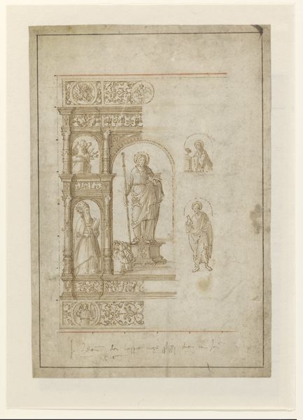 Editor: We're looking at a page from "Biblia Pauperum," "The Annunciation, flanked by Eve and the Serpent and Gideon's Fleece," from between 1445 and 1485, created by an anonymous artist. It’s a pen drawing used as a print. It’s got a narrative quality, almost like a comic. I find it very visually dense! How do you interpret this work, considering its historical context? Curator: This blockbook page offers a fascinating window into late medieval understandings of theology, gender, and power. The central image of the Annunciation is framed by Eve and the serpent on one side, and Gideon's fleece on the other. These juxtapositions are not accidental. Editor: How so? Curator: Think about the narratives being presented. We have the Virgin Mary, obedient and pure, contrasted with Eve, who succumbed to temptation. Consider these figures within a broader socio-political framework: what messages about female roles and agency were being reinforced in the late medieval period? Do you notice the figures beneath each scene, enclosed by arched doorways and lettered script? Editor: Now that you point it out, the contrast between the purity and temptation narratives does speak volumes about social power! The male figures seem almost like authorities. What impact do you think this art had in a time of significant patriarchal control? Curator: Blockbooks like this were instrumental in disseminating religious ideas, and they acted as vehicles for shaping cultural values. The stark contrasts would solidify contemporary, albeit patriarchal, social structures, casting Eve as a symbol of feminine weakness. I think such pieces reinforced specific behaviours within an increasingly strict societal construct. Editor: This framework gives me a new understanding and perspective. It’s eye-opening to consider not just what the art depicts but also the historical and social conversations that are amplified and challenged. Curator: Precisely. Art like this serves as a primary source. Exploring these historical tensions adds depth to what we see, which opens doors for richer dialogues and deeper revelations.