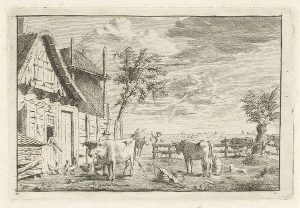 "Boerenerf met koeien," or "Farmyard with cows," was made by Pieter de Goeje in the early 19th century. It's a print, specifically an etching, made by drawing into a waxy ground on a metal plate, which is then exposed to acid. In this small, but captivating print, de Goeje skillfully uses the etching process to create a serene rural scene. The fine lines and delicate shading bring life to the cows and the rustic farmyard, while the surrounding landscape is defined through a labor-intensive, and highly skilled process. The artist has left visible the marks of production, imbuing it with social significance. There's a definite connection between the imagery depicted, with its intimations of labor and agricultural production, and the labor-intensive etching technique itself. The artist is drawing a parallel between the work required to sustain a community, and the intense process of artistic production. This piece reminds us that understanding the materials, making, and context can reveal the full meaning of a work of art.