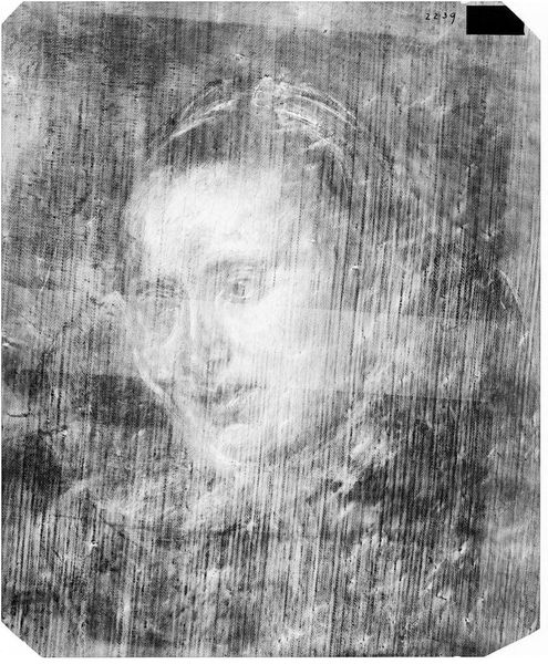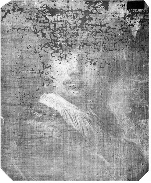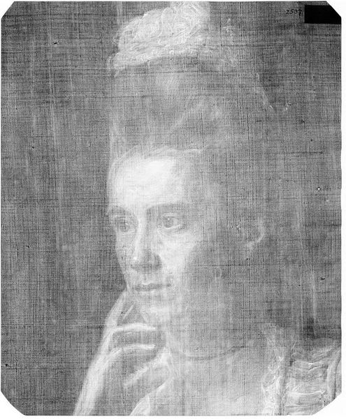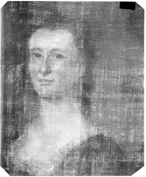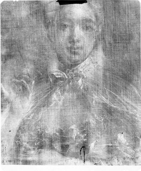 Editor: This is an X-radiograph of "Anne Comstock" after Gilbert Stuart. It’s fascinating to see the ghostly underlayers beneath the surface. What do you see when you look at the composition? Curator: The X-ray unveils a structural geometry otherwise hidden. Note the density variations, revealing the artist's process of layering. The stark contrast emphasizes the subject's form. Editor: So, you are focusing on the formal aspects of the work? Curator: Precisely. The composition becomes an interplay of dark and light, a study in tonal architecture rather than mere representation. Editor: I see. So, beyond the subject, the technique itself is the focus. Thanks! Curator: Indeed. A fascinating glimpse into the construction of an image.