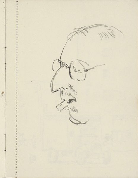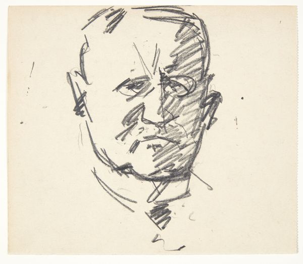 Curator: Here we have Cornelis Vreedenburgh’s “Head of a Man with Glasses,” a drawing made sometime between 1890 and 1946. Editor: My immediate reaction is that there’s a distinct melancholy to the work. The downward gaze, the simplified lines... it speaks to a quiet resignation. Curator: Interesting. For me, what stands out is the artist's deliberate choice of pencil and paper. It points to accessibility, to a medium readily available. Was this portrait destined for a grand salon, or was it always meant to be more immediate, more democratic? And did this subject have the social means to pay the artist to capture the essence of himself? Editor: Well, considering the timeframe, it's difficult to ignore the rising tide of anxiety permeating intellectual circles. The portrait could reflect the individual's struggle for visibility amidst societal upheaval. It speaks of a crisis in representation, almost like the person’s identity is being simplified or erased. I wonder about this individual and the weight they had to bear at such a transformative time in the world. Curator: Yes, the minimalist technique emphasizes the face. We should consider the paper quality itself – is it mass-produced or something more specialized? The means of production reflect larger artistic movements challenging traditional notions of art and craft during the 20th century, making space for the democratization of tools and subject matter, regardless of who the subject is. Editor: Absolutely. It’s fascinating how the glasses themselves function as both a literal and metaphorical lens. They signify intellectualism, but also create a barrier, perhaps speaking to the inaccessibility of knowledge, or the way perception is always mediated by structures of power. What did being nearsighted mean at this time? It brings to mind ideas of seeing, knowing, and being seen, all complicated by visual impairment. Curator: Examining the material and the circumstances allows us to reconsider these common notions through an economic and social lens. I see this now more like an exercise on capturing someone and bringing his experience in the world, perhaps unseen and burdened, to light. Editor: I concur. It's compelling how a seemingly simple sketch, with a focus on identity and social context, manages to convey the profound sense of societal burdens on this figure’s posture and downward-cast gaze.
