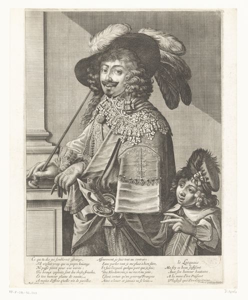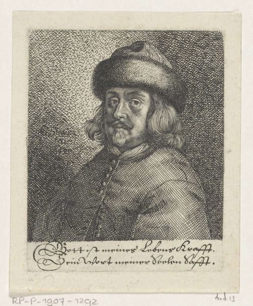 Frans Everbag created this small print, "Vrolijke drinker," using an unidentified printing technique. The sitter's immediate presence stems from Everbag's use of tone, a limited palette of earth colours, and a direct gaze. The soft textures and diffused light give the image a warm, inviting quality. The sitter seems to be emerging from a hazy atmosphere, highlighted by the contrast between the dark, wide-brimmed hat and the crisp white collar. Everbag seems to reflect on the tradition of portraiture, playing with elements of light, shadow, and form to create a modern interpretation of a classical subject. This challenges viewers to reconsider the boundaries between past and present, and to recognize how artistic conventions evolve over time. Note how the subject's somewhat open gesture—a hand raised, a glass tilted—suggests an interruption, an invitation, or perhaps a challenge to the viewer. The way the formal elements are structured asks us to consider not only what we see, but also how we interpret it.