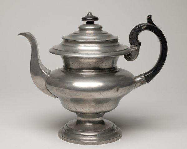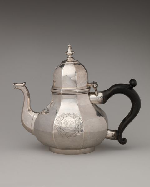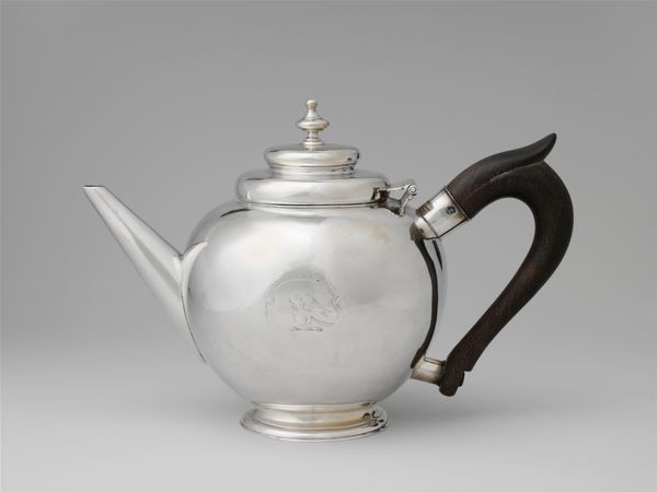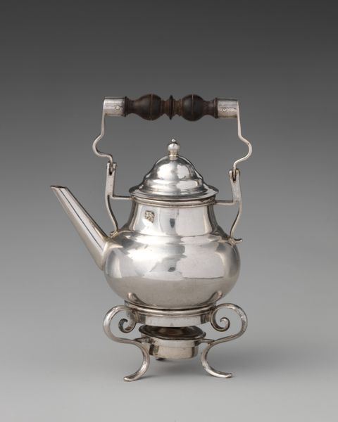 Curator: Before us, we have a rather charming example of decorative art: a miniature kettle with cover, crafted in silver between 1718 and 1719. Editor: My immediate impression is that of quiet dignity. The object has a stoic simplicity despite the ornamental style; it is also rather petite, evoking intimacy. Curator: Yes, it does seem to embody the restrained side of the Baroque. Its reduced size speaks to an individual ritual, doesn't it? Perhaps solitary contemplation, away from grand courtly display? The kettle acts as a symbol of warmth and sustenance, condensed into an almost personal icon. Editor: Icon or toy? I see an attempt to manipulate scale for effect. Consider the relationship between the smooth curvature of the silver body and the rectilinear geometry of its fixings: it highlights the formal paradox. It is a functional object striving toward aesthetic refinement through visual counterpoint. Curator: You view the geometric tensions as a contradiction; I am inclined to read this as a carefully designed paradox. It reflects society’s evolving view of daily routines and self-perception, I think. Silver often symbolizes purity. The kettle, as a result, transmutes something as common as boiling water into something closer to alchemy. Editor: A charming interpretation, though perhaps projecting backwards a touch! Let's acknowledge the artist’s choices here: the subtle gradations in the silver itself, the curve and balance of the ivory handle... All speak to refined craftsmanship and aesthetic balance achieved within a contained volume. Curator: Exactly. It shows that functional items are vessels for profound meaning and values, encoding layers of cultural context and societal shifts far beyond their mere practical applications. Editor: And beyond the socio-historical readings, let’s celebrate the subtle artifice inherent in this kettle's miniature form; that it is art precisely because it plays with the boundaries of its medium, material, and size.