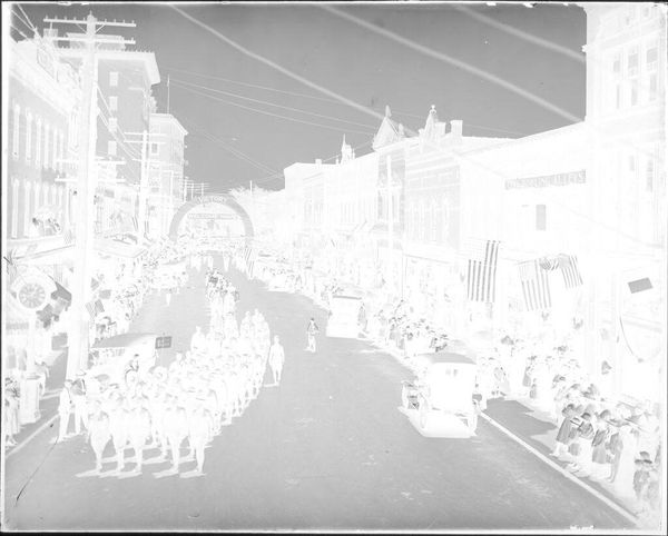 Editor: This photograph, "Untitled (4th of July victory parade)" by Hamblin Studio, shows what appears to be a festive procession. The composition seems to focus on the marchers, but I'm curious about the context. What can you tell me about its historical significance? Curator: It’s interesting to consider this image as a staged performance of civic identity. Think about how these parades were carefully constructed events. How do you think such displays shaped public opinion and reinforced notions of patriotism? Editor: I imagine it fostered a sense of unity, especially after periods of conflict. Curator: Exactly. And these images circulated widely, further amplifying that message. By considering the photograph as a document of this carefully managed performance, we can begin to unpack the complexities of public celebrations. Editor: That’s a fresh way to look at it. Thanks! Curator: My pleasure. It is always rewarding to see history come to life.