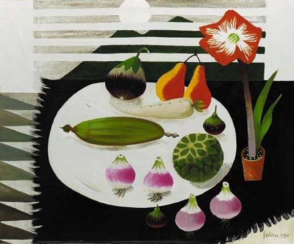 Editor: This is Mary Fedden’s "Ben's Box," painted in 1994 using oil paints. There’s a playful, almost naive quality to it, and the colour palette is dominated by striking reds. How do you read the composition in this still life? Curator: The composition is remarkably considered, wouldn't you agree? The layering of forms, both geometric and organic, establishes a carefully balanced tension. The zebra in the background is unexpectedly juxtaposed with the striped pitcher in the foreground, creating a subtle mirroring of patterns. How do you perceive the role of colour within this structure? Editor: I see that the repetition of red brings everything together, but also flattens the perspective. It’s almost like a stage set, isn’t it? Curator: Indeed. Note how Fedden employs colour not as representational, but as structural. The near-monochromatic background highlights the nuanced variations within the objects themselves, emphasizing their forms through subtle tonal shifts. The bright orange sun at the horizon—what is its function? Editor: Maybe it is supposed to suggest the presence of something beyond what’s on the table. The unexpected intrusion of this background draws attention to the objects' spatial arrangement. It's less about their "thing-ness" and more about how they interact. Curator: Precisely! Through this arrangement, Fedden seems to explore the very language of painting. It's as if she's saying, “This is not simply a collection of objects; it is a system of signs." Editor: This deeper dive into "Ben's Box" gives me so much to think about, and has taught me so much. Thanks! Curator: And for me too! Analyzing these intrinsic aspects really sharpened my vision, revealing Fedden's manipulation of pictorial space.