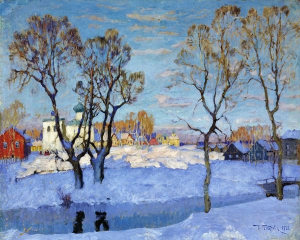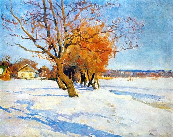 Konstantin Gorbatov captured a snow-laden landscape with oil on canvas in 'A Winter's Day'. The birch trees, with their white bark and delicate branches, stand as silent witnesses to the season's touch. Birch trees have long been symbols of purity and renewal, deeply rooted in the folklore of Northern and Eastern Europe. In pre-Christian times, these trees were associated with fertility rituals and the celebration of new beginnings. Think back to Botticelli's 'Primavera', where the trees form a backdrop to the unfolding of spring's awakening. Here in Gorbatov's winter scene, the birch trees evoke a similar sense of anticipation, promising the eventual return of life after the dormancy of winter. The cool blues and whites resonate with a sense of calm and introspection, reflecting a collective longing for warmth and light during the darkest months. This scene is an invitation to contemplate the cyclical nature of life. The birch tree—a symbol of hope—endures, ready to bud and bloom again.