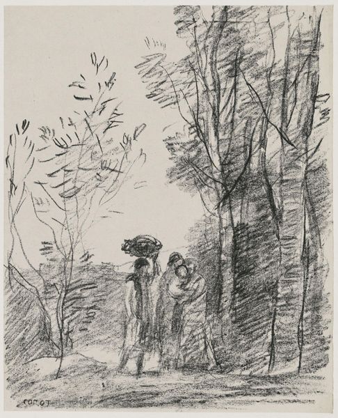 Curator: This is Camille Corot’s drawing, "The Encounter in the Woods", currently residing at the Harvard Art Museums. Editor: It possesses such an immediate sense of the transient, the fleeting moment captured in graphite. Curator: Precisely. Note how Corot uses the rapid, almost scribbled lines to suggest both form and movement. The figures, though present, seem on the verge of dissolving back into the forest itself. Editor: Beyond the formal aspects, it invokes classical imagery of woodland nymphs or perhaps biblical connotations of people wandering in search of shelter. The woods here are not simply trees, they symbolize refuge, the start of a journey perhaps? Curator: A compelling interpretation. The drawing does leave much open to speculation, doesn't it? Perhaps that is its greatest strength—a structured ambiguity. Editor: It is this interplay between technique and symbolic potential that fascinates me. Curator: Yes, a dialogue between structure and symbol.