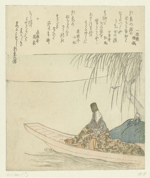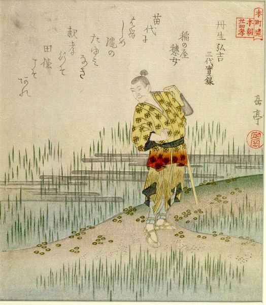 Editor: So, here we have "Twenty-four Japanese Examples of Filial Piety for the Honchoren," a woodblock print by Yashima Gakutei, from around 1821. I'm really struck by how everyday it feels, almost like a snapshot of someone walking through the landscape. What's your take? Curator: It's a wonderful example of Ukiyo-e, these "pictures of the floating world," weren’t just about landscapes or beautiful women; they offer a window into the values of the Edo period. Think about the title—filial piety, respect for one's parents, was a cornerstone of Confucian social order, strongly promoted by the Tokugawa shogunate. Editor: So the seemingly casual nature is deliberate? Curator: Precisely. Gakutei is showing us a man within this complex socio-political framework. What does his journey suggest about the importance of duty in everyday life? Also note the calligraphy - it's more than just descriptive text; how does it contribute to the narrative, considering the context of a print made for a wider public audience? Editor: That's a great point! The text and the image aren’t separate, they work together to convey this idea of filial piety being present even in ordinary moments. Curator: And think about where something like this would have been displayed or consumed. It was mass-produced for common people. Gakutei democratized traditional values and put them into circulation. It transforms the public sphere by providing an educational but affordable visual good. Editor: That helps me understand it so much more! I always saw these prints as beautiful objects, but never considered their powerful cultural role. Curator: Exactly, looking at art through history really unlocks its deeper meaning, revealing the connection between social life and political goals. Editor: I'll definitely approach art with that perspective from now on. Thanks!