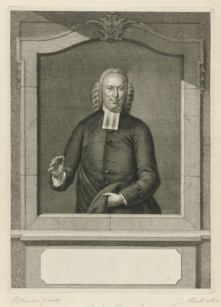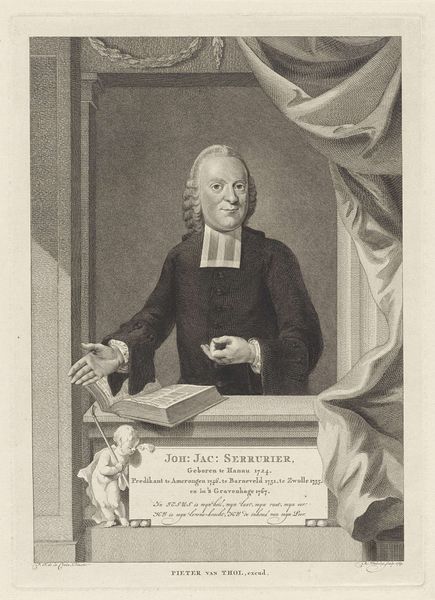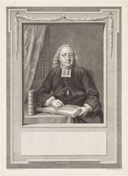 Curator: This is Reinier Vinkeles' "Portret van Johan Diedrich Deiman" from 1782. It's currently held in the Rijksmuseum collection. Editor: It has such a quiet, almost reserved feeling, wouldn't you say? The subdued palette, the way the figure is positioned slightly off-center… everything contributes to this sense of contained composure. Curator: Vinkeles operated in a vibrant Amsterdam, serving a patrician class keen to emulate enlightenment values. The very act of creating a portrait, especially of a scholar or someone of intellectual standing, elevated them. Editor: Note the tight linework defining the face and wig – the rigorous draftsmanship that renders textures so meticulously. His engagement with form reflects neoclassical precision. Curator: Indeed, portraits like this helped consolidate social standing within the Dutch Republic's evolving civic landscape. Deiman himself was an eminent doctor and professor. Representing these professionals broadcasted a culture that valued erudition and learning. Editor: The overall structure also reveals balance in asymmetry. While the figure dominates one side, there's a strong diagonal movement established with the lines of the curtain which balances that. Didactic portraits of scientists at their research? Curator: They subtly promoted particular ideals during a period characterized by growing faith in science and medicine as foundations of civic improvement and public health. Depicting physicians visually reinforced their authority. Editor: So, this wasn't merely a visual record; it played a definite role in cultivating values of intellectual prowess in wider Dutch society. This visual emphasis promoted values. I am persuaded to reflect about it from a fresh viewpoint now. Curator: Precisely. Vinkeles’ skillful execution contributed directly to legitimizing an increasingly influential sector during shifting social configurations. Editor: Examining the composition reminds me that images inherently shape culture and reflect those times. The experience is enriching.