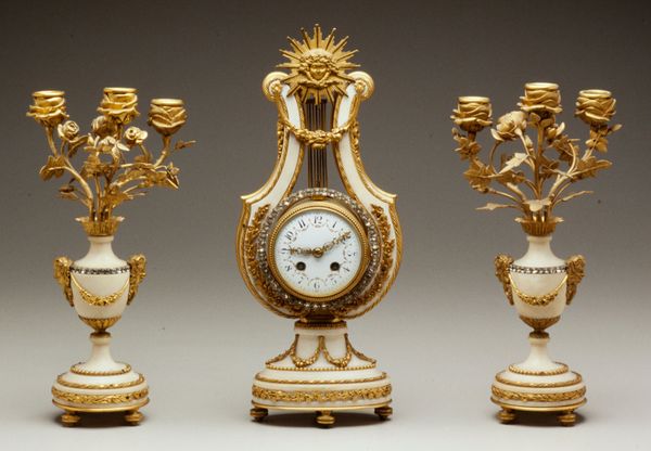 Curator: At first glance, I'm struck by the symmetry and delicate ornamentation. It exudes an air of refined opulence. Editor: Indeed. We are looking at a candlestick from a three-piece Clock Garniture made around 1860. The piece comes to us from France, exhibiting the flair for decorative art emblematic of its culture. Curator: The porcelain, the gilded detailing... it screams Rococo revival. What are the power dynamics reflected in this elaborate display? It feels like a potent symbol of aristocracy and its detachment from broader societal struggles, don’t you think? Editor: From a formalist perspective, consider the craftsmanship evident in the piece’s lines and textures. The porcelain is flawlessly molded and adorned with gilded elements that create visual rhythm and balance. Note the juxtaposition of smooth, reflective surfaces and intricate relief patterns that capture light and draw the eye across the form. Curator: But it’s more than that! The use of candlelight, the timing devices... consider how these were deployed in the past by whom and in what situations. I’d love to unpack that intersection. Editor: Agreed that it has broad potential for social and cultural commentary. Though, I believe focusing purely on the decorative choices elevates our comprehension of artistic intent here. Look at the repetition of motifs; it’s an elaborate semiotic system of status. Curator: A fair point. This certainly sparks more consideration. Even with that aristocratic charge, it’s an excellent piece of decorative work. Editor: Indeed, its value stretches between craft and cultural meaning. Its placement within decorative art is far too limiting when observing through my critical lens.