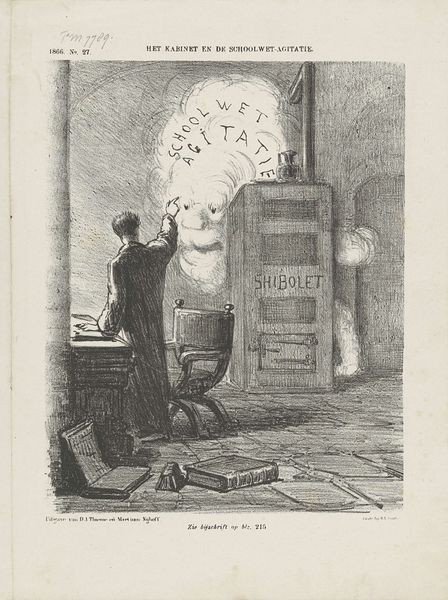Curator: Welcome! The print we're looking at, titled "Nautilus Nemo Room," comes to us from Edouard Riou. Note how he utilized engraving to construct the visual elements, characteristic of 19th-century narrative art. It feels very much like a peek into another world. What strikes you initially about this image? Editor: There's an enclosed feeling that almost borders on claustrophobia, despite the apparent openness of the room's design. I find myself focusing on how time is presented here – literally, a room overflowing with clocks, suggesting not only a study of chronology, but maybe of control. Curator: You’ve identified a key element! These timepieces symbolize the complex relationship between humanity and time, especially within a narrative context. In fiction, controlling time often implies controlling destiny, wouldn't you agree? Perhaps we should read this collection as the iconography of absolute rule. Editor: Absolutely. And given the visual language typical of Romanticism – that idealization of the past with its implicit power structures – one might infer how time functions not just as chronology but as power made tangible. What do you read into these men interacting inside the 'time room'? Curator: Visually, their positioning seems hierarchical, the figure in dark trousers presenting this room and its secrets. They're caught in the act of witnessing, and so are we as the viewer. Think of the cultural obsession with knowing, cataloging. Editor: Right. And I would argue this obsession wasn’t simply a passion, but fundamentally a feature of 19th century society, entwined as it was with imperialism. I'm immediately suspicious about who holds access to this specific type of “knowledge,” given who historically has held actual power. How many are able to access the time room? Curator: A fascinating perspective to be certain, offering critical angles to consider Riou's themes within broader societal conversations about representation and control, inviting contemporary reconsideration. Editor: Well, the image does not allow me to forget such dynamics! It's precisely this blend of aesthetic form and possible context that makes encounters with artworks such a necessary form of interrogation.