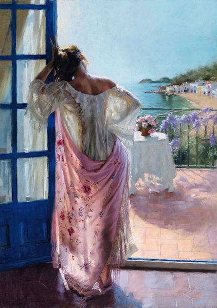 Vicente Romero’s painting depicts a scene of leisure, rendered in oil paints with remarkable attention to light and texture. The painting focuses on the sensuous impression of cloth. We see the weave of the chair, the cool shadows between the gaps in the wicker, and the draped shawl that covers it. Look closely, and you’ll see the delicate embroidery decorating the shawl and dress; likely the result of many hours of skilled labour. These details emphasize the artist’s mastery of his chosen medium. The smooth application of oil paint mimics the soft, flowing texture of the fabrics, while the vibrant colors capture the warmth and light of the Mediterranean setting. Romero engages with traditions of fine art painting while drawing attention to the skilled labor involved in creating luxury textiles. Ultimately, this artwork reminds us of the importance of considering both process and context when interpreting art, and challenges traditional hierarchies between art and craft.