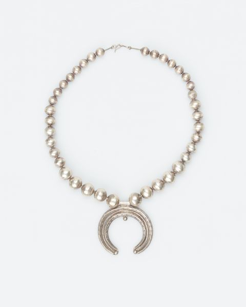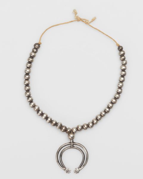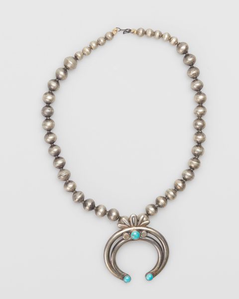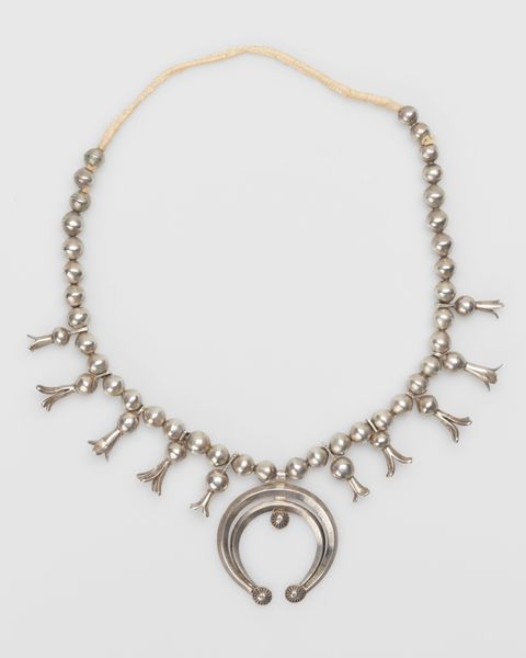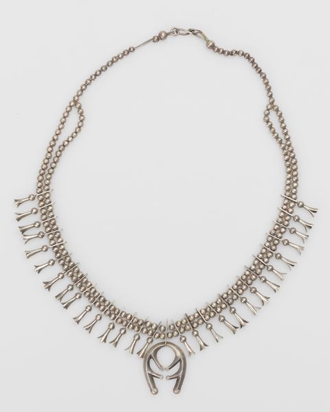 Editor: Here we have a silver necklace created by a Navajo artist, sometime between 1870 and 1880. The circular beads and crescent pendant give it a really striking geometric feel. What strikes you about this piece? Curator: The silversmithing immediately grabs my attention. Consider the labour invested in each of these individual components, each carefully hammered and shaped, the repetitive process of creating the beads, all by hand. What can the materiality of this object tell us about the Diné people and the historical conditions under which this piece was created? Editor: I guess I hadn’t really thought about the sheer work that goes into something like this. Is there something special about silver in this cultural context? Curator: Absolutely. Silverworking wasn't traditionally a Diné craft. Its adoption is intrinsically linked to contact with Europeans and Mexicans, marking a shift in production and economy. The silver itself, likely acquired through trade, would have been a valuable and sought-after material. Editor: So, it’s not just an aesthetic choice, but something more historically significant? Curator: Precisely! It's about the transfer of knowledge, the adoption of new technologies, and the integration of silver into their existing cultural practices and economies. The form also speaks volumes. The crescent shape, known as a "naja," predates Navajo silversmithing and has roots in Spanish colonial ornamentation. Its incorporation signifies cultural exchange and adaptation. The artist makes something entirely new by adapting designs from a pre-existing culture with the new medium they are working with. Editor: That’s really interesting. It reframes the necklace entirely – it's not just a beautiful object, it's a document of a really specific historical moment. Curator: Exactly. It shows how artistic practices are embedded within broader historical and social processes of exchange and adaptation. Editor: Thanks, that gives me a lot to think about.