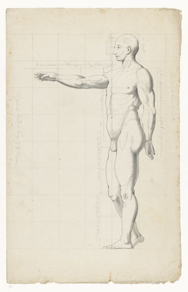 Curator: At first glance, I see this drawing as remarkably utilitarian—the figures almost appearing to be components in a technical drawing. Editor: That’s interesting. Let me offer some background. What we are viewing is entitled "Naaktstudies van vrouw en man, op de rug gezien," which translates to "Nude studies of a woman and man, seen from the back." It's a pencil drawing on paper made by Jan Brandes sometime between 1787 and 1808. What stands out for me is how it presents a normalized vision of the nude human body, and how academic settings helped dictate the style and subject of Brandes' artwork. Curator: Agreed, this clearly served some instructional purpose, perhaps within an artistic academy of the time. You can almost trace the process—the visible gridlines acting as scaffolding, the layered pencil strokes carefully building up the musculature. Were such nudes common teaching tools in art education? Editor: Absolutely. Representing the nude figure was central to academic training, considered essential for history painting and other prestigious genres. Studying anatomy allowed artists to demonstrate their skills but also participate in larger societal conversations around the human form, beauty standards, and even science. This piece shows us those politics of imagery right here. Curator: I’m curious, too, about the paper itself. See how it’s slightly torn and aged? These details give the drawing an objecthood beyond just its representational value. We aren’t only seeing figures; we’re also seeing evidence of the artist’s studio, of art being produced as an exercise, not just a grand statement. Editor: Yes, it is fascinating to consider its context of creation. Brandes made this piece to sharpen his skills, contributing to an educational agenda deeply embedded in societal norms. This kind of piece wasn’t just about creating a perfect body on paper; it was part of a broader system that shaped artistic talent. Curator: Thank you; it gives a deeper meaning to such a simple composition. Editor: It was my pleasure!