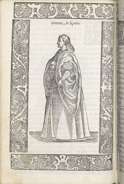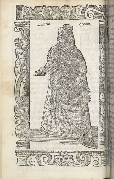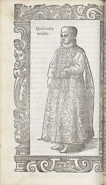Curator: Here we have Christoph Krieger’s "Turkse vrouw," created in 1598. It’s an engraving, showcasing a Turkish woman in what appears to be traditional dress. Editor: The first thing that strikes me is the sheer amount of meticulous detail etched into this print. Look at the patterning on her robe—it seems to vibrate with complexity. It’s mesmerizing. Curator: Absolutely. Let's consider the material qualities. Engraving, as a process, demanded incredible skill and labor. Each line was carefully incised into the metal plate, allowing for mass reproduction, which is no small thing for 1598. Editor: Right, we're looking at printmaking in its early, revolutionary stages of distribution, a technological leap with huge social impact. But it also speaks volumes about how Europeans viewed, and perhaps consumed, the image of the 'Turk' at this time. Was this meant for scientific documentation or titillation? Curator: Good point. And stylistically, notice how the figure is framed—almost imprisoned—by that ornate border. Its presence certainly enhances the composition’s symbolic tension. Editor: It creates a separation, marking her as an outsider, "other." The pattern-work, while skillful, perhaps served a role in reifying a distant, orientalist fantasy. And what do you think of those chopine-like shoes? They speak of class, privilege, fashion. Curator: They are rather extravagant. And they also point to an artistic interest in proportion and height. By placing the woman in elevated shoes, the artist elongates and almost distorts the shape. We get a better sense of line, dimension, and form. Editor: I keep coming back to the act of engraving itself, the artisanry involved in taking steel implements to hard materials to form representational lines—what choices were involved to depict each intricate feature in this period image. What tools? How did it evolve over time? It also leaves me questioning her social status, and the implications of translating cultures for European consumption. Curator: Precisely. It is clear that beyond subject matter, understanding artistic intent here helps us interpret larger structures related to viewing other cultures in art. Editor: This print offers a rich lesson in Renaissance print culture and what materials and process tell us about its global gaze.