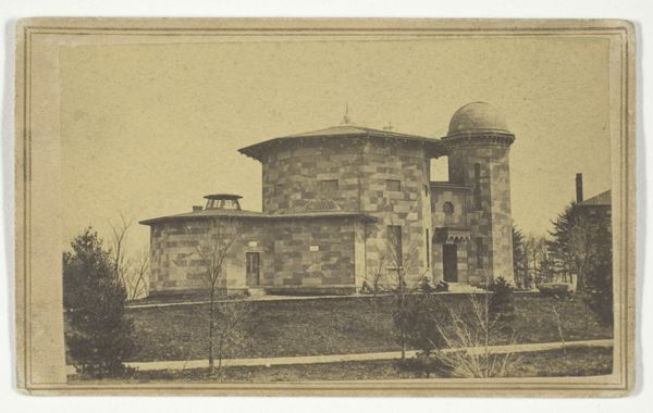 Curator: This image captures "Boswachtershuis Georgshöhe" by Hermann Selle, dating from between 1868 and 1890. The medium, as you can see, is photography. Editor: A strong, simple composition. The vertical thrust of that tower set against the low, horizontal spread of the rest of the building is quite striking. There's an almost unsettling directness to it. Curator: I think it's more complex. This piece sits right on the cusp of German Expressionism in photography, capturing both the aesthetic styles and documenting the socio-political changes. The late 19th century was a period of intense industrialization and urbanization in Germany. This photograph perhaps reveals a longing for an idealized past. Editor: True, but look at the careful placement of that imposing tower—almost aggressively vertical, stark against the relatively muted tones of the building itself. Note also the relationship of the building to the figures. Consider the framing. The texture. Those aspects tell a story regardless of context. Curator: While the formal elements create an unsettling image, it’s undeniable the photographer wanted to also document this historical moment through photography. It became a method of cataloging, even romanticizing a building that served its state and political figure. The way the figures are blurred by what must be a long exposure and what story this might also tell in relation to the historical documentation aspect? Editor: I understand the importance of placing it within its historical timeframe, but you cannot overlook how it exists as shapes and tonalities and values on a flat plane. Curator: Perhaps both viewpoints are relevant here, appreciating both the photograph's formal aspects and the image it projected and promoted through a certain lens. Editor: Absolutely. Together, they enrich our experience.