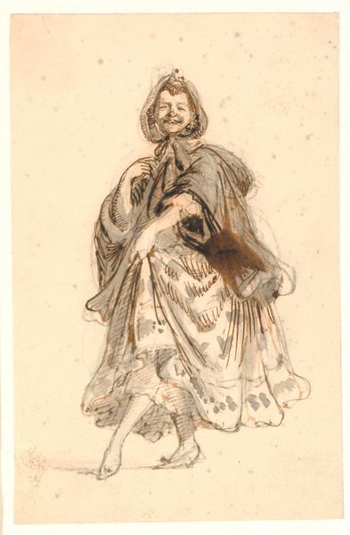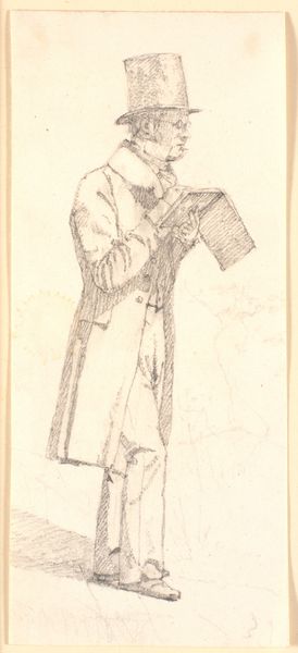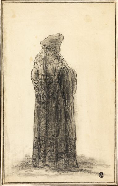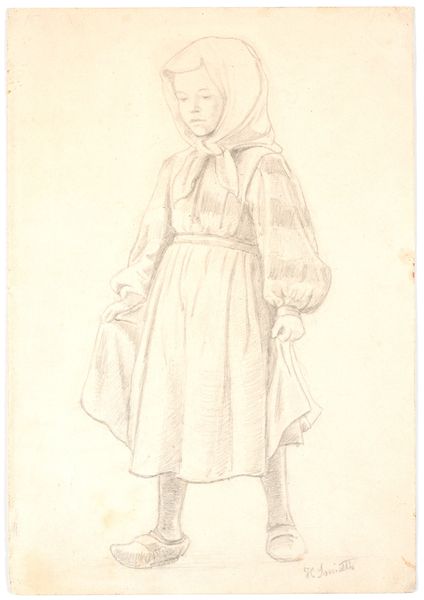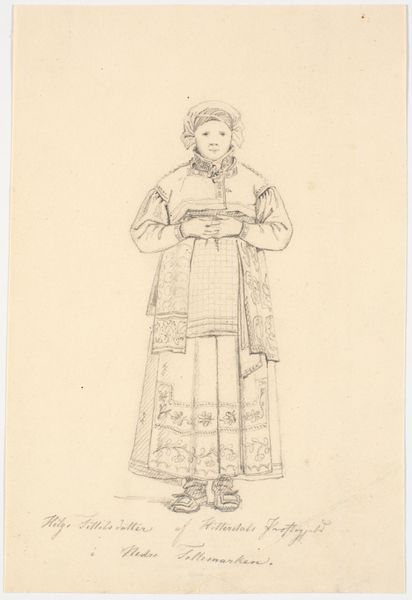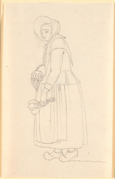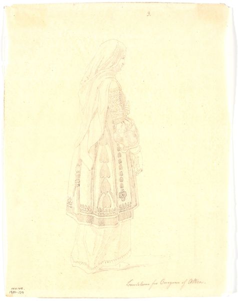 Curator: Looking at this pencil drawing from 1835, we see Martinus Rørbye’s “Bondekone fra Omegnen af Athen i Festdragt,” currently held at the SMK. The title translates to "Peasant Woman from the Outskirts of Athens in Festive Dress." Editor: My initial impression is one of subdued dignity. Despite the detail in the festive dress, there’s a melancholy stillness to her posture and the muted tones of the pencil. Curator: The fact that Rørbye chose to depict a "peasant woman," and in such detail, speaks volumes about his focus. This wasn't about portraying royalty or idealized beauty; it's about capturing the labor and cultural significance embedded in everyday garments. Notice the meticulous rendering of the layers of fabric, likely locally produced textiles. Editor: Absolutely. And it's through these layers that a story unfolds. The headscarf, the patterned skirt - each element carries symbolic weight, a cultural marker defining her identity within that Athenian community. The bowed head, almost a sense of pious reserve. Curator: It begs the question, though, who was this made for? Was this ethnographic study, perhaps catering to a European audience eager to consume images of "exotic" cultures? Or was there something more at stake? Editor: That is interesting. It may be an act of cultural preservation, maybe reflecting an idealized, romanticized view of a disappearing way of life. There’s a visual code at play, inviting viewers to decode her story. It seems that this rendering becomes very different than an immediate "documentary" function, almost becoming elevated. Curator: That elevation speaks to the tension within Romanticism. On one hand, a desire to return to 'authentic' rural life; on the other, the knowledge that these ways of life were inevitably shaped by encroaching modernity. We only need to analyze Rørbye's artistic treatment, for us to determine its role as part of the supply chain. The materiality of the clothes, and that they exist and have meaning far beyond their production. Editor: True, perhaps the clothing even served as amulets. Curator: Thank you, you've made me notice its details! Editor: I can see a cultural narrative through clothing here that I previously missed.