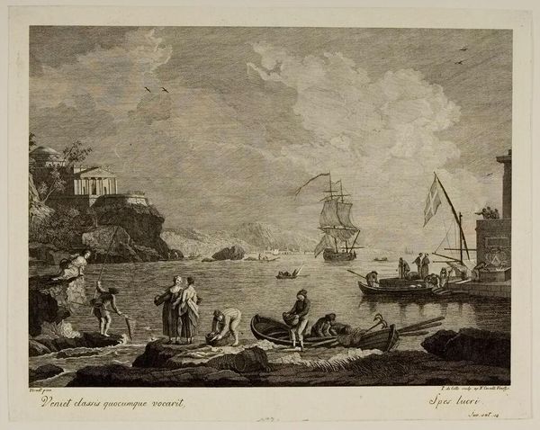 Curator: This is Jean Jacques Leveau’s "Approaching a Strengthened Port," currently residing at the Harvard Art Museums. The dimensions of the image itself are roughly 29 by 41 centimeters. Editor: It's quite striking, isn't it? The whole scene feels heavy with anticipation, like something important is about to happen. Curator: The composition is carefully structured. Note how Leveau employs a clear foreground, middle ground, and background, creating a recession into space. The fortified port acts as a visual anchor. Editor: It’s almost as if the tower is daring the ships to approach. There's a vulnerability here, a raw human element amidst all the stone and sails. Curator: The etching technique allows for fine detail, particularly in the rigging of the ships and the texture of the stone. The interplay of light and shadow adds depth and volume. Editor: It makes me wonder about the stories of the people on those ships, what they’re bringing or leaving behind. It’s all there, hinted at but never fully revealed. A beautiful puzzle. Curator: Indeed. The structural integrity of the composition, combined with the tonal variations, invites a deeper contemplation of maritime power and human endeavor. Editor: A port, fortified or otherwise, is always a threshold, isn’t it? A place of beginnings and endings, captured here with such eloquent precision.