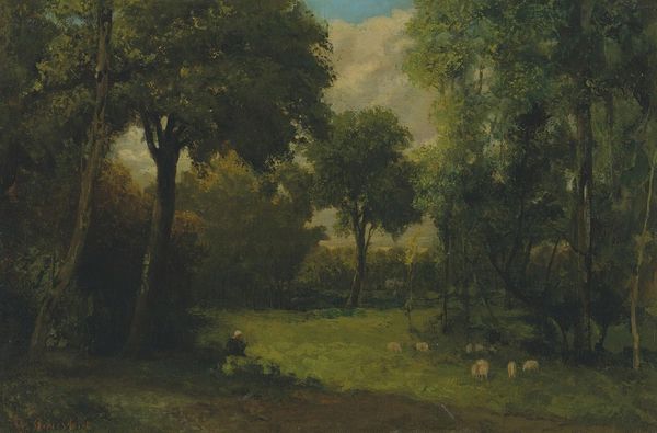 Curator: Right, let’s dive in. Here we have "Santa Barbara Mission," an oil painting by Thomas Moran. Editor: My first impression is tranquility, a dreamy stillness. The muted greens and blues give it an almost ethereal quality. Is it a landscape or a memory? Curator: That's an interesting point. Moran painted this view "en plein air," so capturing a direct sensory experience, but yes, he does evoke Romanticism in the way he softens and idealizes the scenery. What do you see, historically, that comes into play here? Editor: Well, situating this work involves recognizing the legacy of the mission itself, which was a site of both cultural exchange and forced conversion of Indigenous populations. So, there's a tension—a picturesque view overlaying a complex history of colonization. Moran seems to focus on an orientalist fantasy through soft brush strokes and a light that washes over the composition. The painting invites viewers to enjoy the landscape without immediately confronting this difficult history, Curator: That's a compelling reading. For me, there is a stillness with this work that comes also from Moran's observation of the natural world—how he renders light as substance as much as illumination. The way the reflections dance on the water... he really knew his subject! Editor: Absolutely, his technical skill is undeniable. But I wonder, does the beauty distract us from engaging critically with the history embedded in this landscape? Is this how it might’ve been for colonizers to see it and accept its legacy? Curator: Art always holds those questions. And while Moran definitely operates within his time, framing this scene for a particular audience, I appreciate that he encourages me to ask these questions in the first place. What do you make of that solitary figure, there, center left? Editor: Interesting question. Maybe that’s the ghost of the mission’s past coming to meet its legacy. Or a silent protagonist wondering how to place herself here. Curator: In its own way, Moran’s “Santa Barbara Mission” gives the same directive. Thank you for those points. Editor: Of course. Thank you.