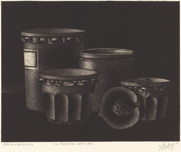 Curator: This is Mario Avati’s “Pipe et Coupelle,” or "Pipe and Cup," a 1961 etching. Editor: Immediately striking! The textures are incredible; that granular background, the smooth gradients on the pipe and the cup—it looks like a photograph but so much more tactile. What was the etching process like here? Curator: The etching is rich in tonal variation. The still life—pipe, cup, and subtly suggested shelf—emerges from a granulated field. Look how the cup form reflects purity and contemplation. Tobacco, of course, has diverse cultural connotations ranging from ritual to social bonding. Editor: Right, and considering the production... etching allows for detail but requires immense patience, controlling the acid erosion, inking, the press—Avati really explores the properties of the medium here. He contrasts a simple, utilitarian pipe and cup, against a background of obsessive, handcrafted labor, it must have been so slow. Curator: The objects themselves are imbued with symbolic value—the cup a chalice of sorts and the pipe a marker of leisure or intellectual pursuit. Notice how their arrangement evokes a feeling of quiet intimacy. Think about the mid-century context—an echo of Surrealist object arrangements? Editor: Maybe. And maybe a statement about the changing values attached to craft, how something mass-produced like the pipe ends up placed next to an almost precious handmade cup, but they are rendered equally and valued. Curator: The enduring allure of the image for me comes from how Avati layers simplicity with visual intricacy and emotional resonance. It invites prolonged reflection on what everyday objects tell us. Editor: I agree. It demonstrates how art can transform mundane materials and practices into meaningful artifacts, inviting a reappraisal of our relationship to both labor and luxury.
