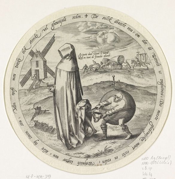 Curator: Let’s take a look at an engraving dating from 1566 to 1570 titled, "De rijke man speelt viool op een kaakbeen" now at the Rijksmuseum. It's attributed to Wierix. What's your immediate reaction? Editor: Stark and unsettling. The composition, trapped in this circular frame, feels incredibly tight. There’s this grim quality to the whole thing, even with the rather foppish figure at the center. Curator: Absolutely. He sits astride a massive jawbone, looking rather self-satisfied as he plays his instrument. That jawbone… it’s such a powerful symbol of mortality. Even his finery doesn't seem to diminish its weight. I can't help thinking that it functions as an allegorical image of mortality, pleasure, and transience. Editor: Right. It draws the eye immediately, doesn’t it? That the artist chose this—likely copperplate—to etch and then print many times… well, there’s a real physical commitment to circulating this message. There is clear attention paid to material detail: the man's plush garments and the detailed towers in the background. These require a specific sort of making that is reliant on the access to certain materials and also specific type of patronage to justify that. Curator: It underscores a keen interest in contrasting fleeting earthly pleasures with inevitable decay. The man is richly dressed, with musical accomplishment, seated jauntily; his posture mocks what we understand from that imposing jawbone beneath. Editor: Agreed. And thinking about it as a print—an easily reproduced and widely distributed image—emphasizes how Wierix critiques class disparity, I believe. To show wealth balanced upon bones really highlights the precarity of class differences. Curator: Consider also that small figure perched atop a tower on the right. I feel as if he suggests something about the fragility of earthly power – all observed and surveilled, as temporal and contingent as that jawbone might suggest. Editor: So much here hints at moralizing impulses mediated through detailed and exquisite craftsmanship. That Wierix uses the form of printmaking only enhances the potency of his message across place and time. It is, to be fair, a fascinating use of the form. Curator: I agree wholeheartedly. There's a layered, lingering presence to the artwork. Editor: Indeed. Thanks for shedding more light on the symbolism.