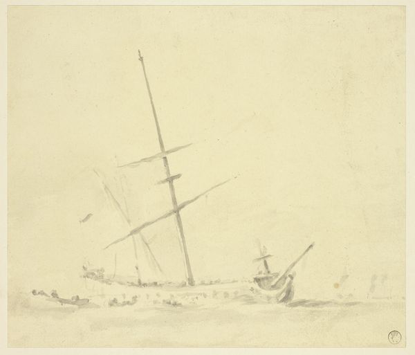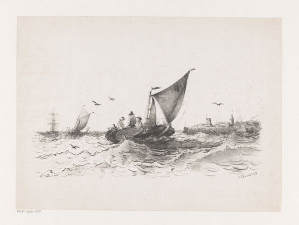 Editor: This etching, "Zeilschip Walvisch uit Oostende op onrustige zee" created by Egidius Linnig in 1842, captures quite a dramatic scene. The rough sea is really the focus for me. How might this work speak to its viewers during that particular time? Curator: That's a great observation. Given the rising tides of nationalism in 19th-century Europe, seascapes were more than just pretty pictures; they could become potent symbols of a nation's power and reach. Look at the *Walvisch*, it isn’t idealized, it is dealing with rough waters, quite close to a capsized ship, if I am seeing correctly. It shows daily life and how vulnerable society was, and invites viewers to really empathize. How might the commercial maritime history impact such art? Editor: That makes perfect sense. The scene, almost looks chaotic. Was there something specific about that reality Linnig was trying to capture, aside from glorifying Belgium's might? Curator: Potentially. Romanticism really held sway, then and Linnig shows us raw emotion in the face of the immensity of nature. Maybe he sought to capture the inherent risks of seafaring, its social impact. It challenges viewers to see both the grandeur and the peril. The maritime activities formed a critical backdrop of daily existence in that era. Consider also where this etching would be displayed – in homes, print shops? Its audience impacts our understanding. How did the rise of print culture help shape views of naval prowess? Editor: That is an angle I hadn't considered. So this isn’t just about what Linnig wanted to say, but about how it engaged within broader conversations? Thank you! Curator: Exactly. It's about art functioning within a historical tapestry. Always look to the conversations surrounding the piece as much as to the piece itself!