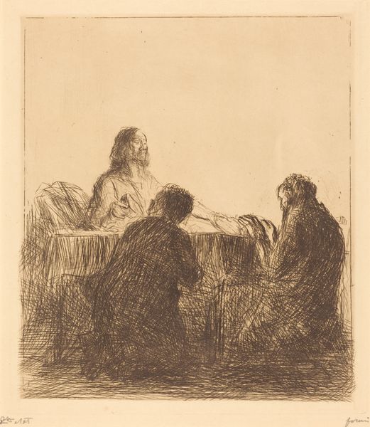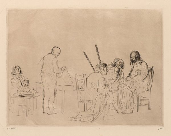 Editor: We’re looking at a piece titled "Madonna and Children" by Jean-Louis Forain. It appears to be a pencil sketch, a flurry of lines depicting a mother with several children. It has a wonderfully intimate feel, like we're catching a glimpse of a private moment. What strikes you when you see this piece? Curator: Ah, yes, Forain. There's a raw vulnerability here, isn't there? It reminds me of charcoal sketches you might find tucked away in Degas' studio, rehearsals for something more, yet complete in their very incompleteness. The artist allows the paper to breathe, letting the sketch emerge rather than forcing it. Do you see how the figures almost dissolve into the background? Editor: Yes, it’s not highly defined. I get a sense of fleeting time, as though this maternal tableau is fading before my eyes. It's as if he captured an image, but the people were just barely staying still. Curator: Exactly. Now, notice how he positions the Madonna. She's surrounded, almost overwhelmed, yet her gaze is directed inward. Is it love? Resignation? Or perhaps both, mingled into that messy, beautiful reality of motherhood. What does that inward gaze communicate to you? Editor: Perhaps it speaks to the universality of motherhood, how it is beautiful and timeless, while the scene is set to be very human. There’s almost a sacred feeling, like he’s capturing the soul of this role. It feels deeply empathetic. Curator: Precisely. And Forain, master that he was, knew that the profound is often found in the everyday, in these quick, seemingly unfinished glimpses into life's tenderest moments. Editor: I never considered the “unfinished” nature as being part of the intended effect, but I see that now. Thanks!